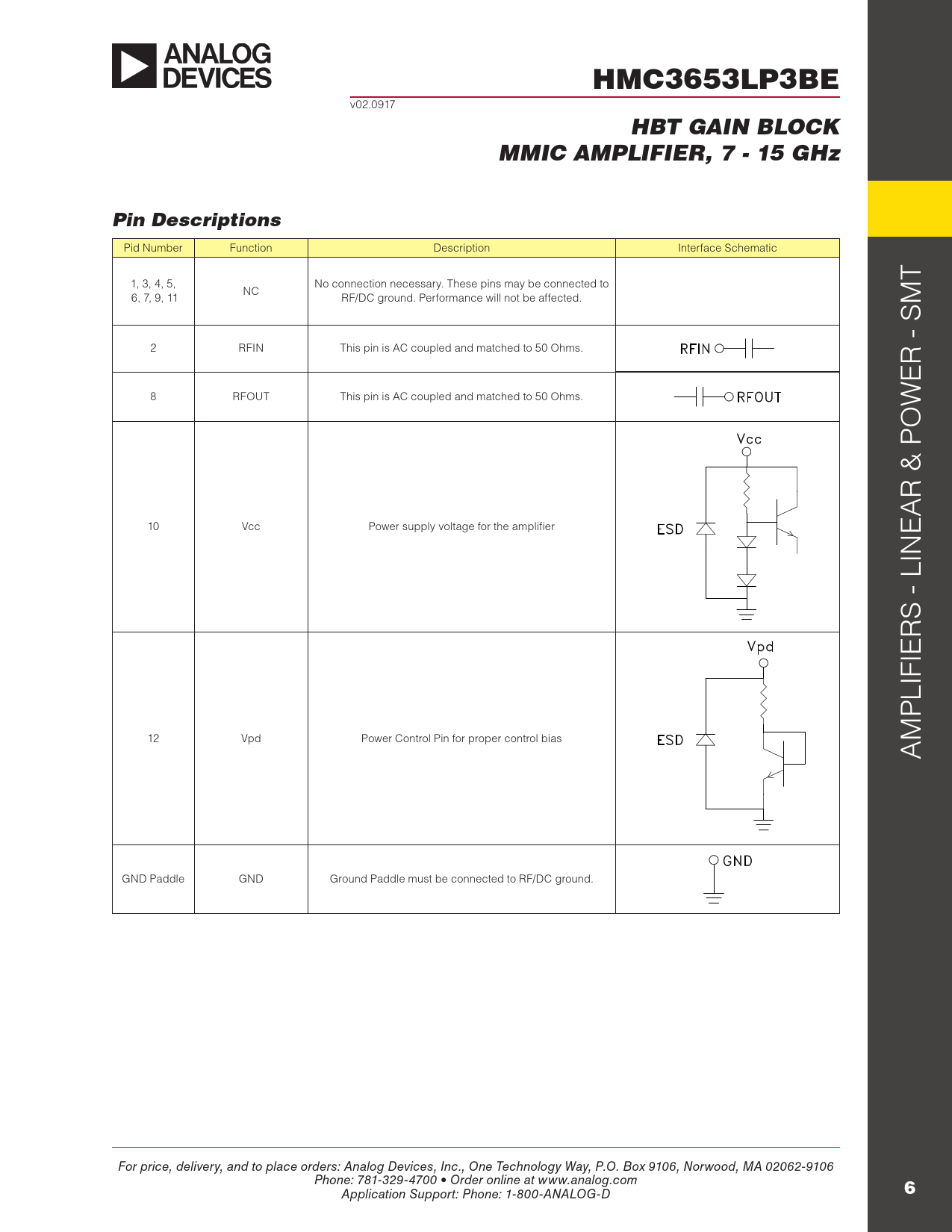 HMC3653LP3BE v02.0917 HBT GAIN BLOCKMMIC AMPLIFIER, 7 - 15 GHzPin Descriptions pid number function Description interface schematic T 1, 3, 4, 5, no connection necessary. These pins may be connected to nC 6, 7, 9, 11 rf/DC ground. performance will not be affected. m s 2 rfin This pin is AC coupled and matched to 50 ohms. er - 8 rfoUT This pin is AC coupled and matched to 50 ohms. w po r & A 10 Vcc power supply voltage for the amplifier e lin s - plifier 12 Vpd power Control pin for proper control bias m A GnD paddle GnD Ground paddle must be connected to rf/DC ground. For price, delivery, and to place orders: Analog Devices, Inc., One Technology Way, P.O. Box 9106, Norwood, MA 02062-9106 Phone: 781-329-4700 • Order online at www.analog.com Application Support: Phone: 1-800-ANALOG-D 6 Document Outline Typical Applications Features Functional Diagram General Description Electrical Specifications Second Harmonics vs. Pout Second Harmonics vs. Vdd @ Pout = 18 dBm Second Harmonics vs. Temperature @ Pout = 18 dBm Power Dissipation Power Compression @ 10 GHz Psat vs. Vdd P1dB vs. Vdd Psat vs. Temperature P1dB vs. Temperature Noise Figure vs. Frequency Output Return Loss vs. Temperature Input Return Loss vs. Temperature Gain vs. Temperature Gain & Return Loss Absolute Maximum Ratings Typical Supply Current vs. Vdd Outline Drawing Die Packaging Information Pad Descriptions Assembly Diagram Application Circuit