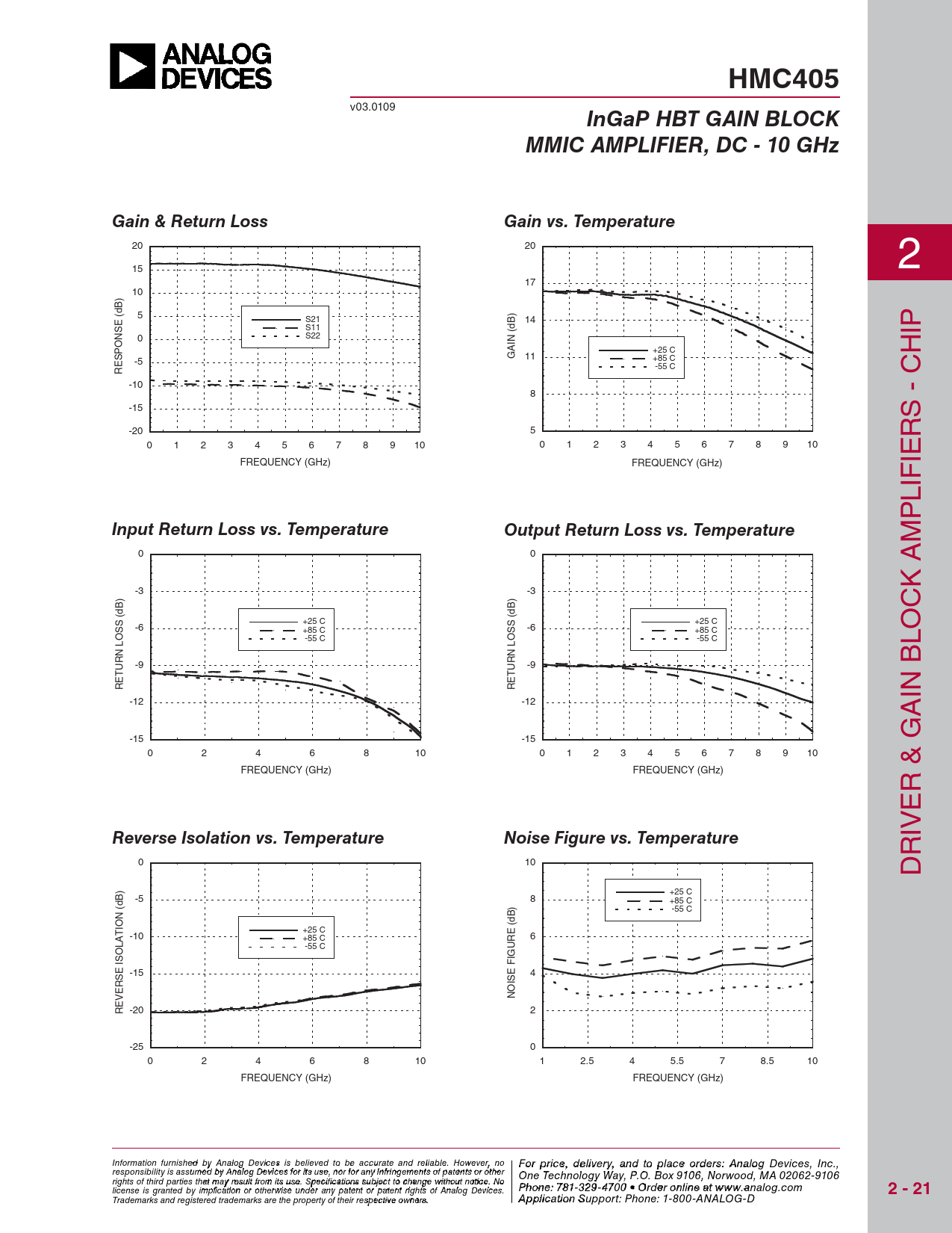 HMC405. InGaP HBT GAIN BLOCK. MMIC AMPLIFIER, DC - 10 GHz. Gain & Return Loss. Gain vs. Temperature