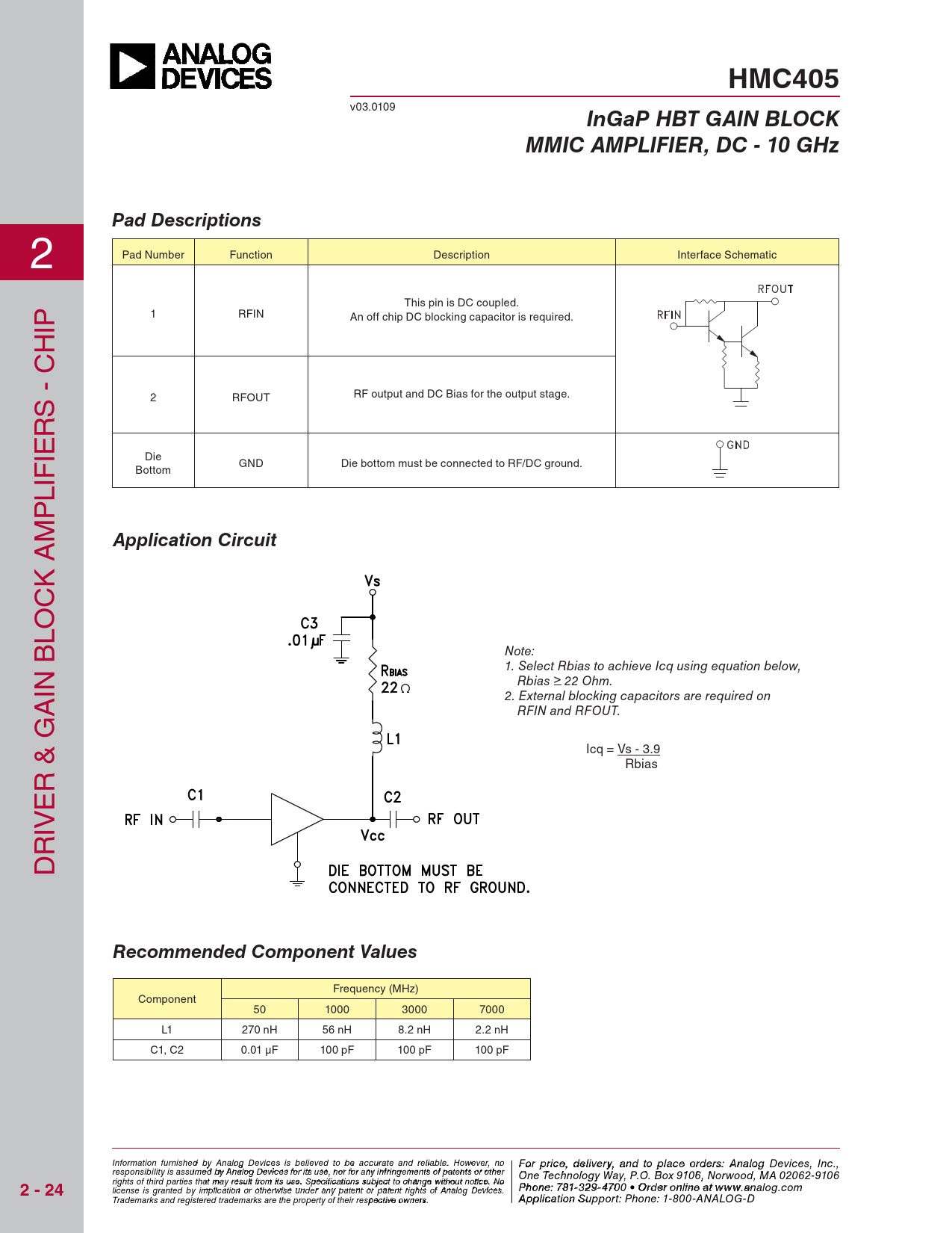 HMC405. InGaP HBT GAIN BLOCK. MMIC AMPLIFIER, DC - 10 GHz. Pad Descriptions. Application Circuit. Recommended Component Values