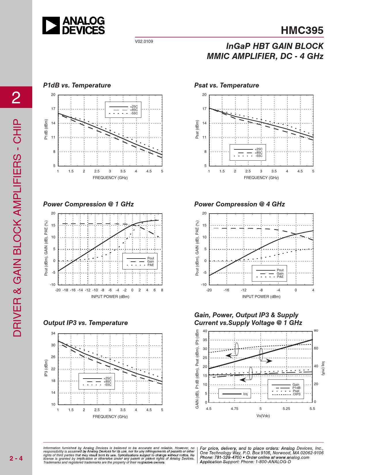 ) D 40 80 34 35 30 30 60 26 25 Ic q (mA) Psat (dBm), IP3 (dBm 20 40 22 IP3 (dBm) 15 +25C 18 +85C -55C 10 Gain 20 P1dB Psat 14 5 Icq OIP3 0 0 10 GAIN (dB), P1dB (dBm), 4.5 4.75 5 5.25 5.5 1 1.5 2 2.5 3 3.5 4 4.5 5 Vs(Vdc) FREQUENCY (GHz) Information furnish F ed obr pri y Anal ce, de og Device li s vie s r beyli, a eve nd to pla d to be accura ce o te and rder reliabl s e , pl . Ho ease co wever, no For price, delivery, and to place orders: Analog Devices, Inc., responsibility is assumed by Analog Devices for its use, nor for any infringements of patents or other ntact Hittite Microwave Corporation: One Technology Way, P.O. Box 9106, Norwood, MA 02062-9106 rights of third parties that may result from its use. Specifications subject to change without notice. No