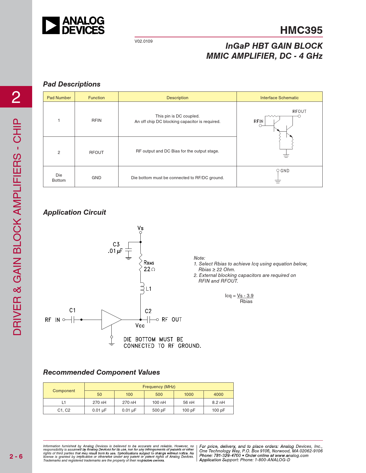 HMC395. InGaP HBT GAIN BLOCK. MMIC AMPLIFIER, DC - 4 GHz. Pad Descriptions. Application Circuit. Recommended Component Values