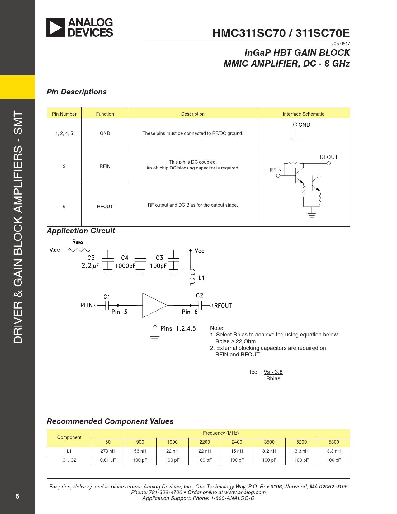 HMC311SC70 / 311SC70E v05.0517 InGaP HBT GAIN BLOCKMMIC AMPLIFIER, DC - 8 GHzPin Descriptions T Pin Number Function Description Interface Schematic M 1, 2, 4, 5 GND These pins must be connected to RF/DC ground. S - S R IE This pin is DC coupled. 3 RFIN An off chip DC blocking capacitor is required. LIF P M 6 RFOUT RF output and DC Bias for the output stage. K A C Application Circuit LO IN B A R & G E IV R Note: D 1. Select Rbias to achieve Icq using equation below, Rbias > 22 Ohm. 2. External blocking capacitors are required on RFIN and RFOUT. Icq = Vs - 3.8 Rbias Recommended Component Values Frequency (MHz) Component 50 900 1900 2200 2400 3500 5200 5800 L1 270 nH 56 nH 22 nH 22 nH 15 nH 8.2 nH 3.3 nH 3.3 nH C1, C2 0.01 µF 100 pF 100 pF 100 pF 100 pF 100 pF 100 pF 100 pF For price, delivery, and to place orders: Analog Devices, Inc., One Technology Way, P.O. Box 9106, Norwood, MA 02062-9106 Phone: 781-329-4700 • Order online at www.analog.com 5 Application Support: Phone: 1-800-ANALOG-D Document Outline Typical Applications Features Functional Diagram General Description Electrical Specifications Typical Performance Characteristics Broadband Gain & Return Loss Gain vs. Temperature Input Return Loss vs. Temperature Output Return Loss vs. Temperature Reverse Isolation vs. Temperature Noise Figure vs. Temperature P1dB vs. Temperature Psat vs. Temperature Power Compression @ 1 GHz Power Compression @ 6 GHz Output IP3 vs. Temperature Gain, Power, IP3 & Supply Current vs. Supply Voltage @ 1 GHz Absolute Maximum Ratings Outline Drawing Package Information Pin Descriptions Application Circuit Recommended Component Values Evaluation PCB List of Materials for Evaluation PCB