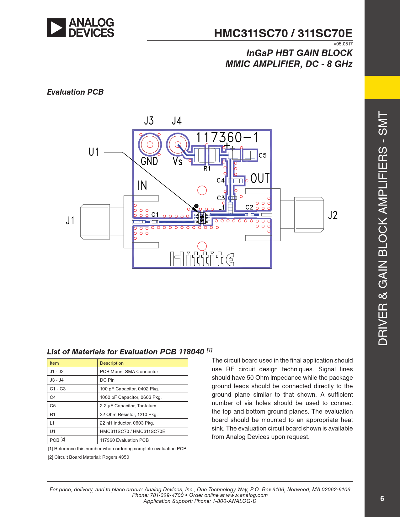 HMC311SC70 / 311SC70E. InGaP HBT GAIN BLOCK. MMIC AMPLIFIER, DC - 8 GHz. Evaluation PCB