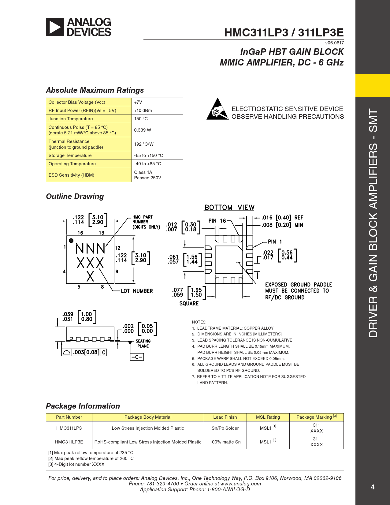 HMC311LP3 / 311LP3E. InGaP HBT GAIN BLOCK. MMIC AMPLIFIER, DC - 6 GHz. Absolute Maximum Ratings. Outline Drawing
