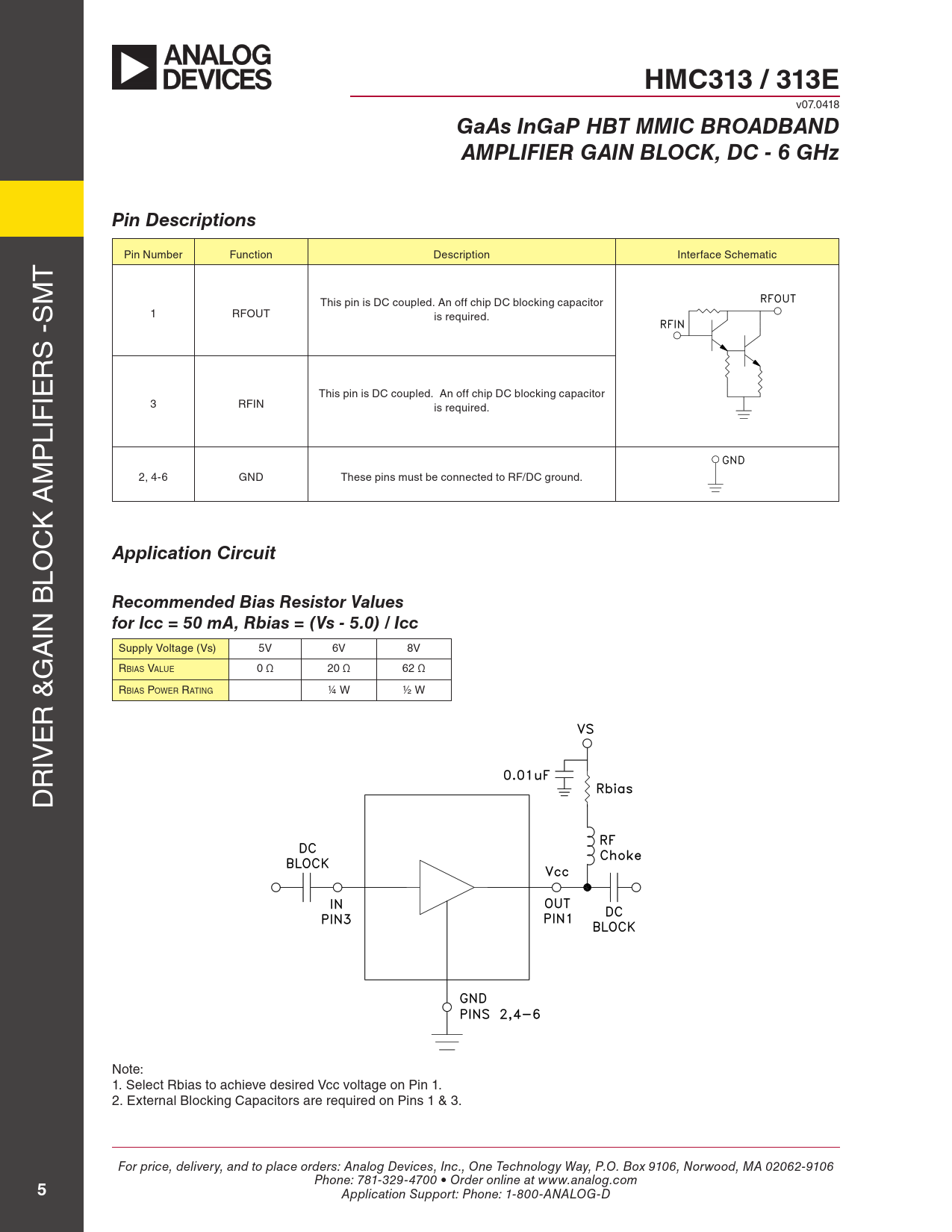 HMC313 / 313E. GaAs InGaP HBT MMIC BROADBAND. AMPLIFIER GAIN BLOCK, DC - 6 GHz. Pin Descriptions. Application Circuit