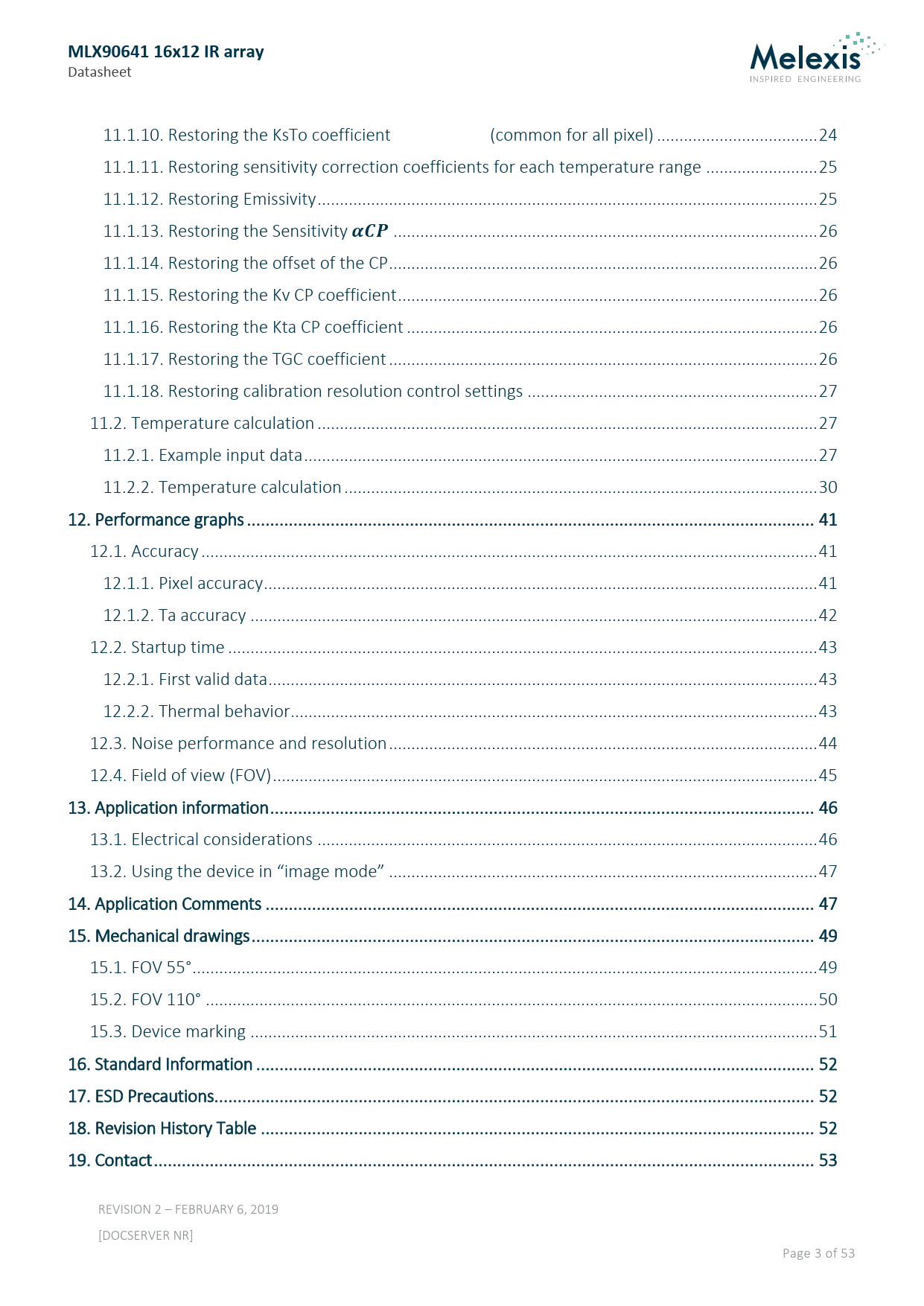 Datasheet 11.1.10. Restoring the KsTo coefficient (common for all pixel) .. 24 11.1.11. Restoring sensitivity correction coefficients for each temperature range ... 25 11.1.12. Restoring Emissivity .. 25 11.1.13. Restoring the Sensitivity ... 26 11.1.14. Restoring the offset of the CP .. 26 11.1.15. Restoring the Kv CP coefficient .. 26 11.1.16. Restoring the Kta CP coefficient .. 26 11.1.17. Restoring the TGC coefficient .. 26 11.1.18. Restoring calibration resolution control settings ... 27 11.2. Temperature calculation .. 27 11.2.1. Example input data ... 27 11.2.2. Temperature calculation .. 30 12. Performance graphs .. 41 12.1. Accuracy .. 41 12.1.1. Pixel accuracy .. 41 12.1.2. Ta accuracy ... 42 12.2. Startup time .. 43 12.2.1. First valid data ... 43 12.2.2. Thermal behavior.. 43 12.3. Noise performance and resolution .. 44 12.4. Field of view (FOV) .. 45 13. Application information ... 46 13.1. Electrical considerations .. 46 13.2. Using the device in “image mode” .. 47 14. Application Comments .. 47 15. Mechanical drawings ... 49 15.1. FOV 55° .. 49 15.2. FOV 110° ... 50 15.3. Device marking ... 51 16. Standard Information .. 52 17. ESD Precautions ... 52 18. Revision History Table ... 52 19. Contact .. 53 REVISION 2 – FEBRUARY 6, 2019 [DOCSERVER NR] Page 3 of 53