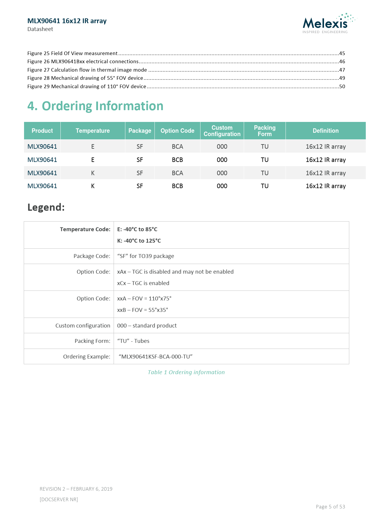 Package Code: “SF” for TO39 package Option Code: xAx – TGC is disabled and may not be enabled xCx – TGC is enabled Option Code: xxA – FOV = 110°x75° xxB – FOV = 55°x35° Custom configuration 000 – standard product Packing Form: “TU” - Tubes Ordering Example: “MLX90641KSF-BCA-000-TU” Table 1 Ordering information REVISION 2 – FEBRUARY 6, 2019 [DOCSERVER NR] Page 5 of 53