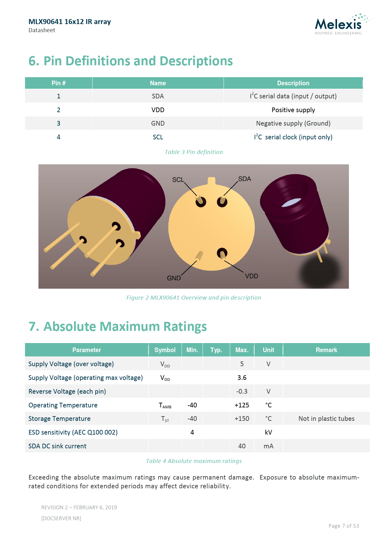 MLX90641 16x12 IR array. 6. Pin Definitions and Descriptions. Pin #. Name. Description. 7. Absolute Maximum Ratings. Parameter