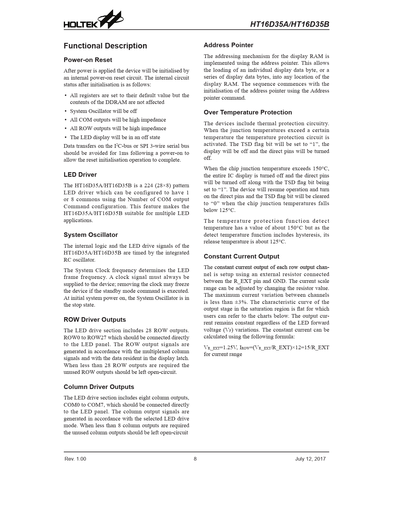 the entire IC display is turned off and the direct pins The HT16D35A/HT16D35B is a 224 (28×8) pattern will be turned off along with the TSD flag bit being LED driver which can be configured to have 1 set to “1”. The device will resume operation and turn or 8 commons using the Number of COM output on the direct pins and the TSD flag bit will be cleared Command configuration. This feature makes the to “0” when the chip junction temperatures falls HT16D35A/HT16D35B suitable for multiple LED below 125°C. applications. The temperature protection function detect temperature has a value of about 150°C but as the