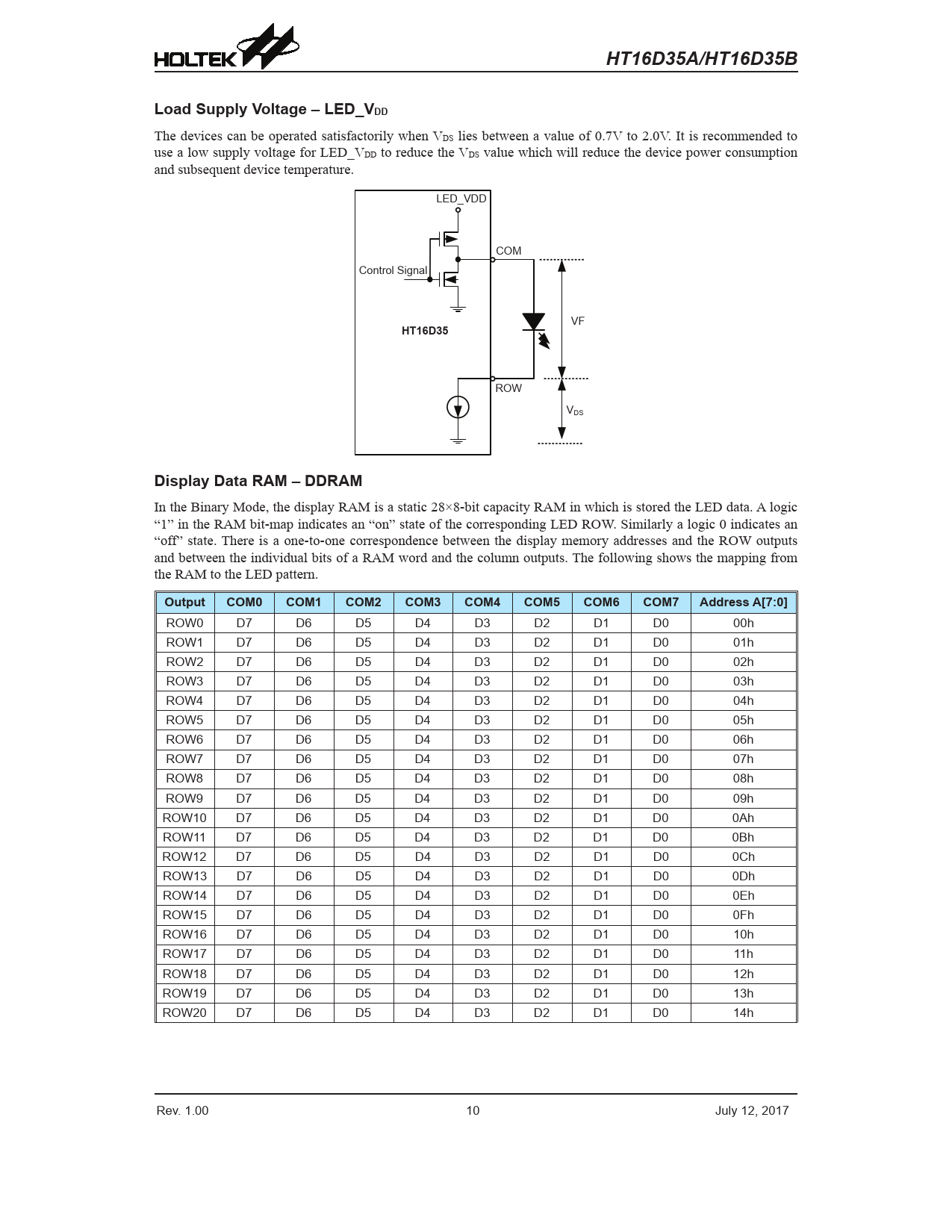 HT16D35A/HT16D35BLoad Supply Voltage – LED_VDD The devices can be operated satisfactorily when VDS lies between a value of 0.7V to 2.0V. It is recommended to use a low supply voltage for LED_VDD to reduce the VDS value which will reduce the device power consumption and subsequent device temperature. LED_VDD COM Control Signal VF HT16D35 ROW VDS Display Data RAM – DDRAM In the Binary Mode, the display RAM is a static 28×8-bit capacity RAM in which is stored the LED data. A logic “1” in the RAM bit-map indicates an “on” state of the corresponding LED ROW. Similarly a logic 0 indicates an “off” state. There is a one-to-one correspondence between the display memory addresses and the ROW outputs and between the individual bits of a RAM word and the column outputs. The following shows the mapping from the RAM to the LED pattern. OutputCOM0COM1COM2COM3COM4COM5COM6COM7Address A[7:0] ROW0 D7 D6 D5 D4 D3 D2 D1 D0 00h ROW1 D7 D6 D5 D4 D3 D2 D1 D0 01h ROW2 D7 D6 D5 D4 D3 D2 D1 D0 02h ROW3 D7 D6 D5 D4 D3 D2 D1 D0 03h ROW4 D7 D6 D5 D4 D3 D2 D1 D0 04h ROW5 D7 D6 D5 D4 D3 D2 D1 D0 05h ROW6 D7 D6 D5 D4 D3 D2 D1 D0 06h ROW7 D7 D6 D5 D4 D3 D2 D1 D0 07h ROW8 D7 D6 D5 D4 D3 D2 D1 D0 08h ROW9 D7 D6 D5 D4 D3 D2 D1 D0 09h ROW10 D7 D6 D5 D4 D3 D2 D1 D0 0Ah ROW11 D7 D6 D5 D4 D3 D2 D1 D0 0Bh ROW12 D7 D6 D5 D4 D3 D2 D1 D0 0Ch ROW13 D7 D6 D5 D4 D3 D2 D1 D0 0Dh ROW14 D7 D6 D5 D4 D3 D2 D1 D0 0Eh ROW15 D7 D6 D5 D4 D3 D2 D1 D0 0Fh ROW16 D7 D6 D5 D4 D3 D2 D1 D0 10h ROW17 D7 D6 D5 D4 D3 D2 D1 D0 11h ROW18 D7 D6 D5 D4 D3 D2 D1 D0 12h ROW19 D7 D6 D5 D4 D3 D2 D1 D0 13h ROW20 D7 D6 D5 D4 D3 D2 D1 D0 14h Rev. 1.00 10 July 12, 2017 Document Outline Features Applications General Description Selection Table Block Diagram Pin Assignment Pin Description Absolute Maximum Ratings D.C. Characteristics A.C. Characteristics A.C. Characteristics – SPI 3-wire Serial Bus A.C. Characteristics – I2C Serial Bus Timing Diagrams SPI 3-Wire Serial Bus Timing I2C Bus Timing Power on Reset Timing Functional Description Power-on Reset LED Driver System Oscillator ROW Driver Outputs Column Driver Outputs Address Pointer Over Temperature Protection Constant Current Output Setting the Output Current Load Supply Voltage – LED_V Display Data RAM – DDRAM LED Driver Output Waveform Output Signal Timing Fade Data RAM Universal COM (UCOM) RAM Data Universal SEG (USEG) RAM Data Matrix Masking RAM Data Command Description – Command Table Software Reset Binary/Gray Select Number of COM Outputs Global Blinking Cascade Mode System Control Constant Current Ratio Global Brightness Mode Control Scrolling Control Scrolling Speed COM Pin Control ROW Pin Control Direct Pin Control Read Flag Read Status Write Display Data Write Fade Data Write UCOM Data Write USEG Data Write Matrix Masking Data SPI 3-wire Serial Interface I2C Serial Interface Power Supply Sequence Operation Flow Chart Application Circuits LED Matrix Circuit Single LED IC Application Cascade Function Cascade Control Flow Package Information 48-pin LQFP (7mm×7mm) Outline Dimensions (Exposed Pad)