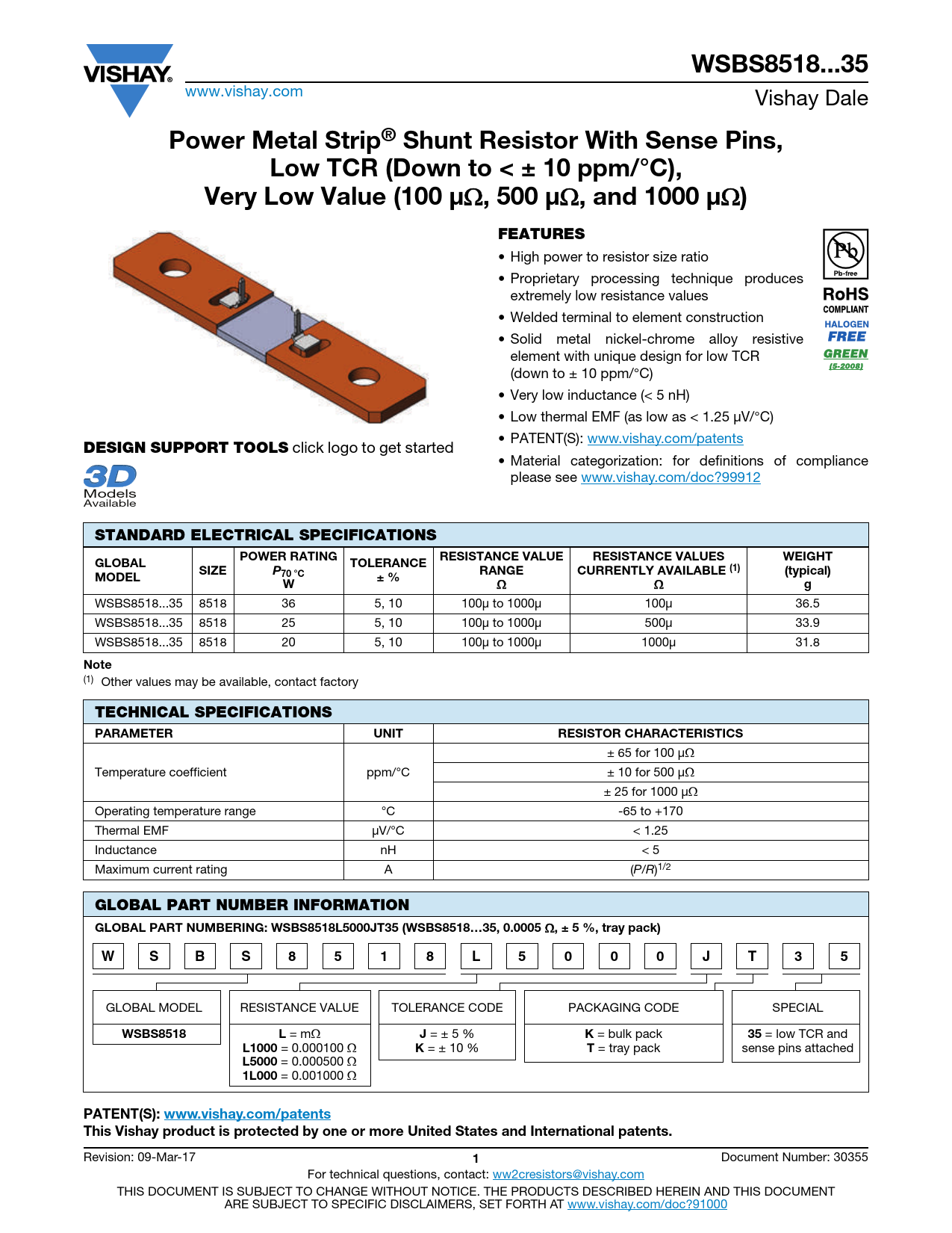 GLOBAL PART NUMBER INFORMATION GLOBAL PART NUMBERING: WSBS8518L5000JT35 (WSBS8518…35, 0.0005 , ± 5 %, tray pack) W S B S 8 5 1 8 L 5 0 0 0 J T 3 5