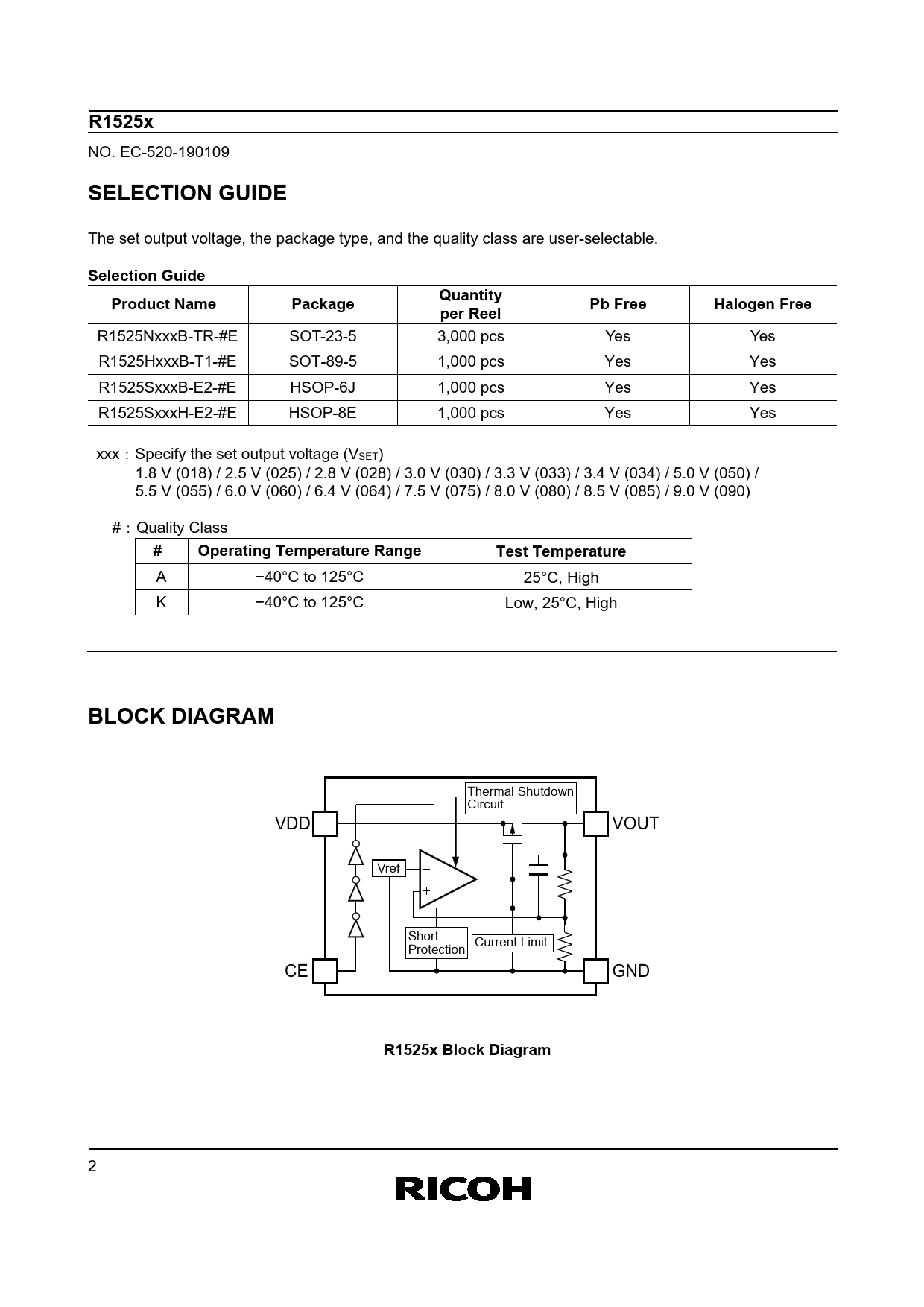 R1525x. SELECTION GUIDE. Selection Guide. Quantity. Product Name. Package. Pb Free. Halogen Free. per Reel. Operating Temperature Range