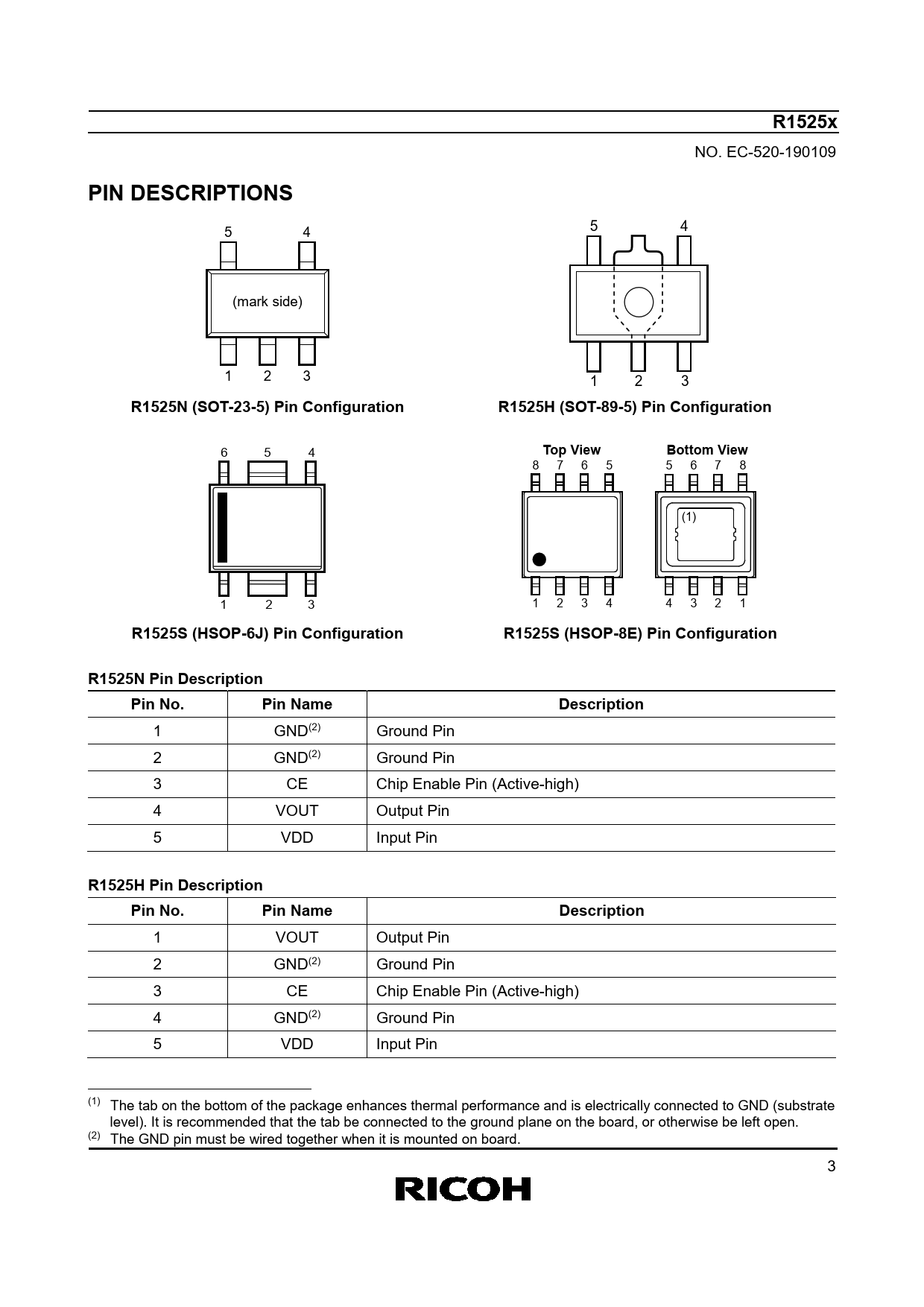 | Pages / Page | 27 / 3 — R1525x. PIN DESCRIPTIONS. R1525N (SOT-23-5) Pin Configuration. R1525H … |