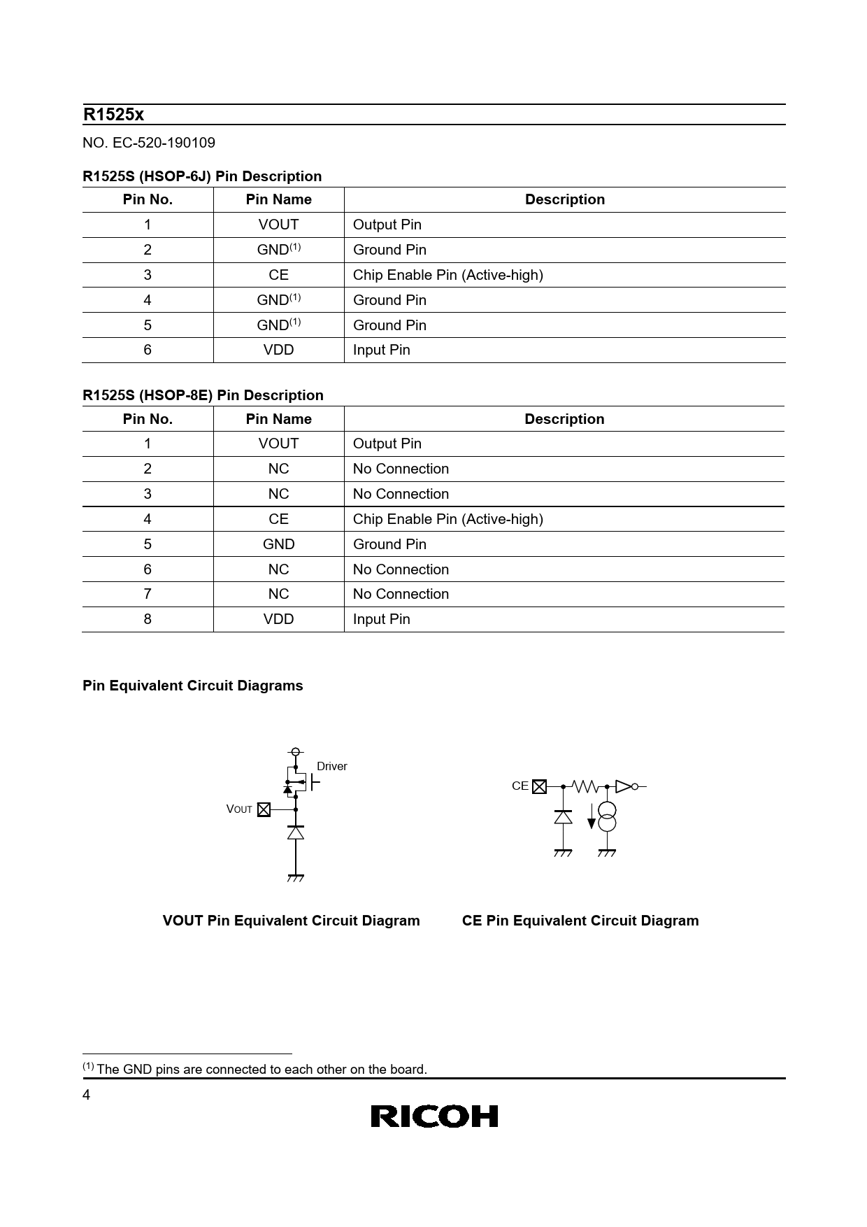 | Pages / Page | 27 / 4 — R1525x. R1525S (HSOP-6J) Pin Description. Pin No. Pin Name. Description. … |
