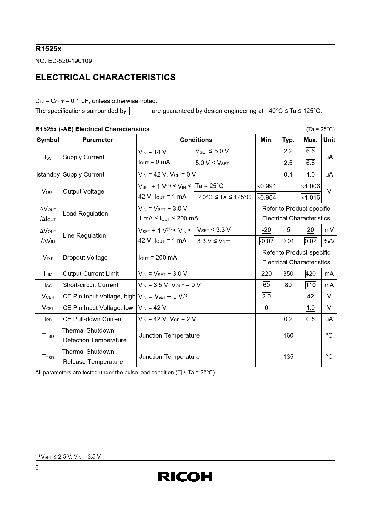 R1525x NO. EC-520-190109 ELECTRICAL CHARACTERISTICS CIN = COUT = 0.1 μF, unless otherwise noted. The specifications surrounded by are guaranteed by design engineering at −40°C ≤ Ta ≤ 125°C. R1525x (-AE) Electrical Characteristics (Ta = 25°C) SymbolParameterConditionsMin.Typ.Max. Unit VIN = 14 V VSET ≤ 5.0 V 2.2 6.5 ISS Supply Current μA IOUT = 0 mA 5.0 V < VSET 2.5 6.8 Istandby Supply Current VIN = 42 V, VCE = 0 V 0.1 1.0 μA VSET + 1 V(1) ≤ VIN ≤ Ta = 25°C 0.994 1.006 VOUT Output Voltage V 42 V, IOUT = 1 mA −40°C ≤ Ta ≤ 125°C 0.984 1.016 VOUT VIN = VSET + 3.0 V Refer to Product-specific Load Regulation /IOUT 1 mA ≤ IOUT ≤ 200 mA Electrical Characteristics VOUT VSET + 1 V(1) ≤ VIN ≤ VSET < 3.3 V -20 5 20 mV Line Regulation /VIN 42 V, IOUT = 1 mA 3.3 V ≤ VSET -0.02 0.01 0.02 %/V Refer to Product-specific VDIF Dropout Voltage IOUT = 200 mA Electrical Characteristics ILIM Output Current Limit VIN = VSET + 3.0 V 220 350 420 mA ISC Short-circuit Current VIN = 3.5 V, VOUT = 0 V 60 80 110 mA VCEH CE Pin Input Voltage, high VIN = VSET + 1 V(1) 2.0 42 V VCEL CE Pin Input Voltage, low VIN = 42 V 0 1.0 V IPD CE Pull-down Current VIN = 42 V, VCE = 2 V 0.2 0.6 μA Thermal Shutdown TTSD Junction Temperature 160 °C Detection Temperature Thermal Shutdown TTSR Junction Temperature 135 °C Release Temperature All parameters are tested under the pulse load condition (Tj ≈ Ta = 25C). (1) VSET ≤ 2.5 V, VIN = 3.5 V 6