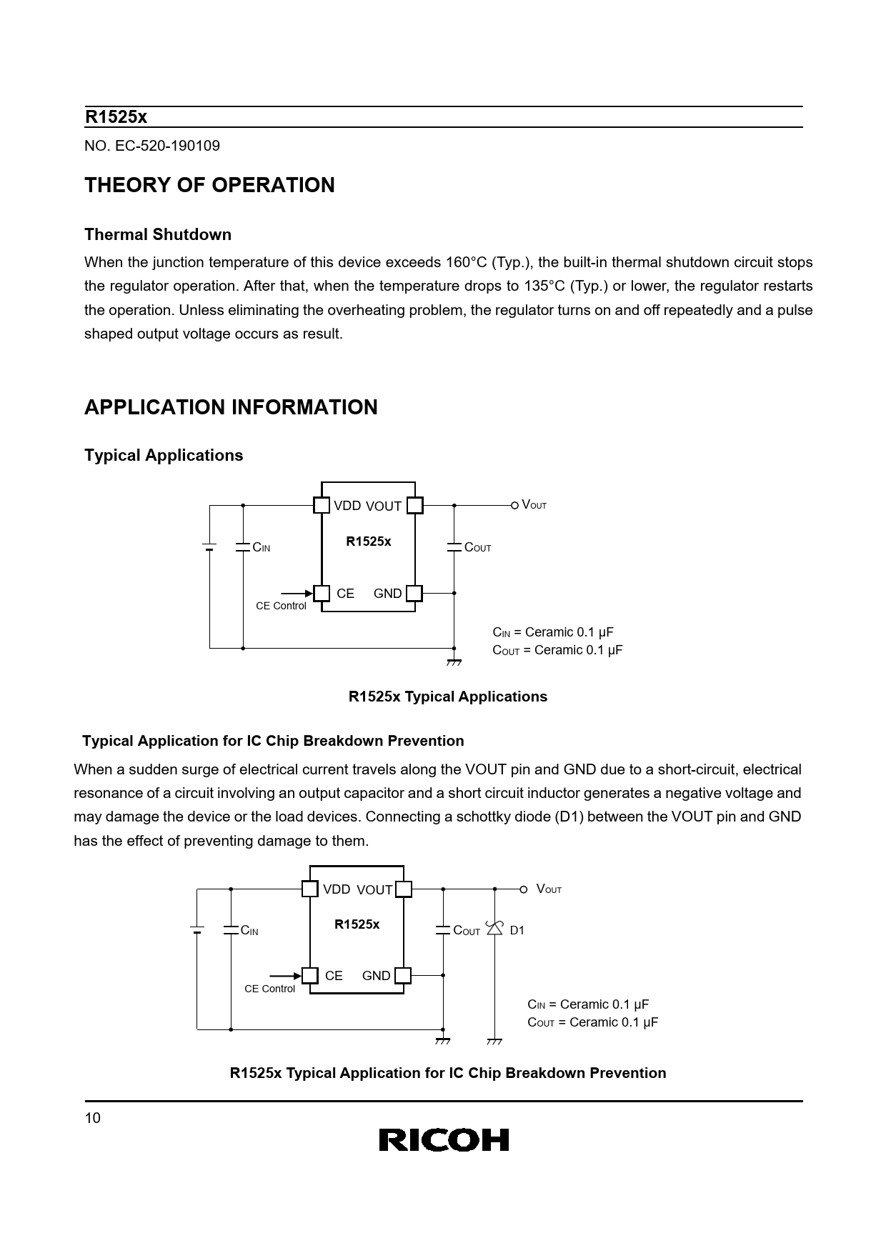 R1525x NO. EC-520-190109 THEORY OF OPERATION Thermal Shutdown When the junction temperature of this device exceeds 160°C (Typ.), the built-in thermal shutdown circuit stops the regulator operation. After that, when the temperature drops to 135°C (Typ.) or lower, the regulator restarts the operation. Unless eliminating the overheating problem, the regulator turns on and off repeatedly and a pulse shaped output voltage occurs as result. APPLICATION INFORMATIONTypical Applications VDD VOUT VOUT CIN R1525x COUT CE GND CE Control CIN = Ceramic 0.1 µF COUT = Ceramic 0.1 µF R1525x Typical ApplicationsTypical Application for IC Chip Breakdown Prevention When a sudden surge of electrical current travels along the VOUT pin and GND due to a short-circuit, electrical resonance of a circuit involving an output capacitor and a short circuit inductor generates a negative voltage and may damage the device or the load devices. Connecting a schottky diode (D1) between the VOUT pin and GND has the effect of preventing damage to them. VDD VOUT VOUT CIN R1525x COUT D1 CE GND CE Control CIN = Ceramic 0.1 µF COUT = Ceramic 0.1 µF R1525x Typical Application for IC Chip Breakdown Prevention 10