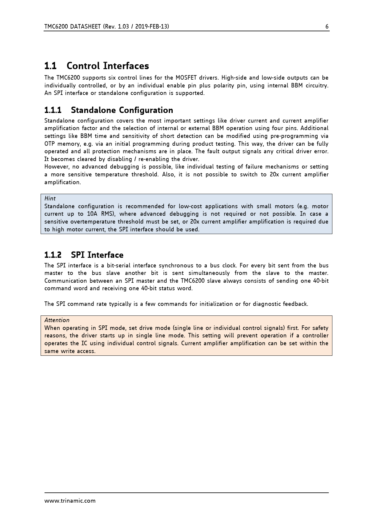 The SPI interface is a bit-serial interface synchronous to a bus clock. For every bit sent from the bus master to the bus slave another bit is sent simultaneously from the slave to the master. Communication between an SPI master and the TMC6200 slave always consists of sending one 40-bit command word and receiving one 40-bit status word. The SPI command rate typically is a few commands for initialization or for diagnostic feedback. Attention When operating in SPI mode, set drive mode (single line or individual control signals) first. For safety reasons, the driver starts up in single line mode. This setting will prevent operation if a controller operates the IC using individual control signals. Current amplifier amplification can be set within the same write access. www.trinamic.com