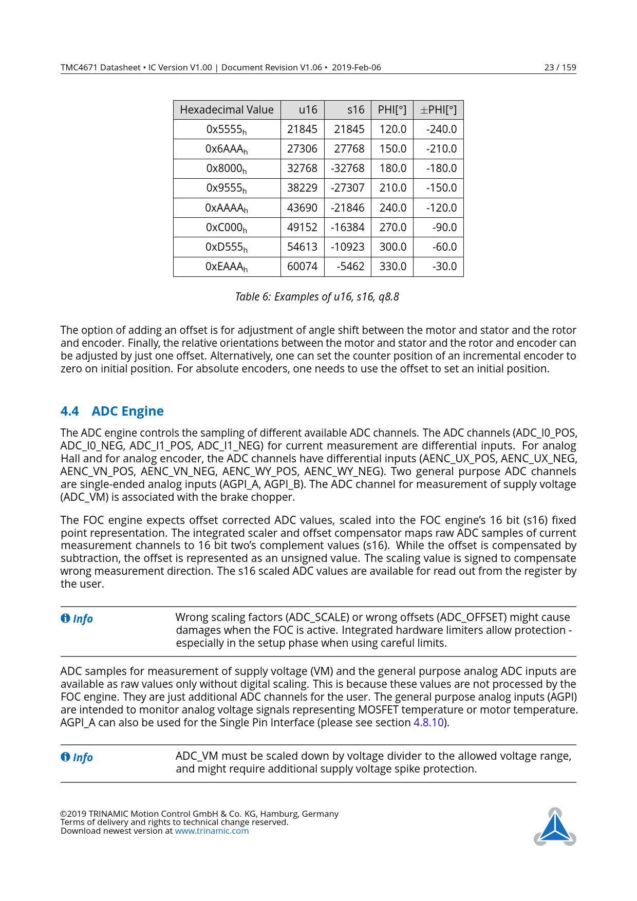 link to page 48 TMC4671 Datasheet • IC Version V1.00 | Document Revision V1.06 • 2019-Feb-06 23 / 159 Hexadecimal Value u16 s16 PHI[°] ±PHI[°] 0x5555 21845 21845 120.0 -240.0 h 0x6AAA 27306 27768 150.0 -210.0 h 0x8000 32768 -32768 180.0 -180.0 h 0x9555 38229 -27307 210.0 -150.0 h 0xAAAA 43690 -21846 240.0 -120.0 h 0xC000 49152 -16384 270.0 -90.0 h 0xD555 54613 -10923 300.0 -60.0 h 0xEAAA 60074 -5462 330.0 -30.0 h Table 6: Examples of u16, s16, q8.8 The option of adding an offset is for adjustment of angle shift between the motor and stator and the rotor and encoder. Finally, the relative orientations between the motor and stator and the rotor and encoder can be adjusted by just one offset. Alternatively, one can set the counter position of an incremental encoder to zero on initial position. For absolute encoders, one needs to use the offset to set an initial position.