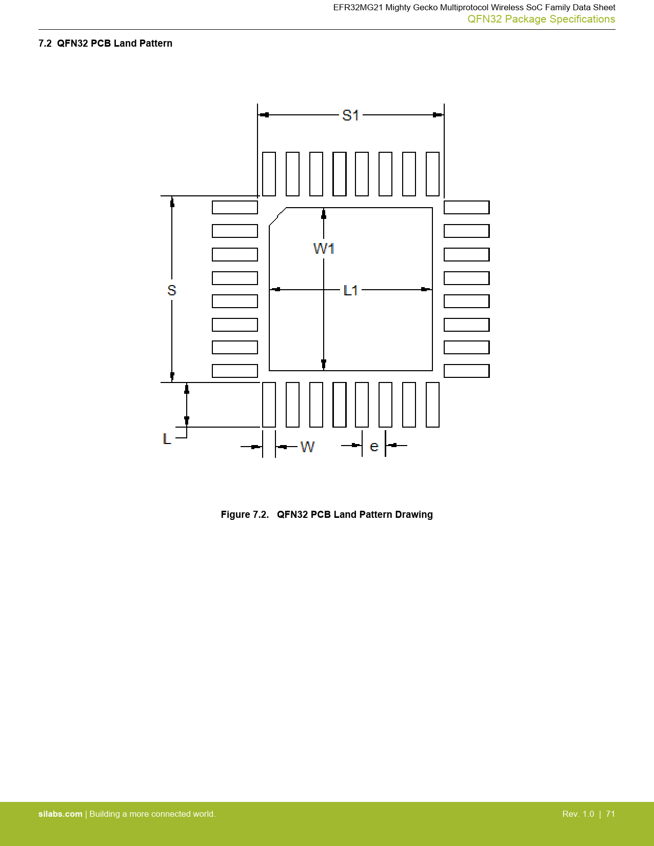 EFR32MG21 Mighty Gecko Multiprotocol Wireless SoC Family Data Sheet QFN32 Package Specifications 7.2 QFN32 PCB Land PatternFigure 7.2. QFN32 PCB Land Pattern Drawingsilabs.com | Building a more connected world. Rev. 1.0 | 71 Document Outline 1. Feature List 2. Ordering Information 3. System Overview 3.1 Introduction 3.2 Radio 3.2.1 Antenna Interface 3.2.2 Fractional-N Frequency Synthesizer 3.2.3 Receiver Architecture 3.2.4 Transmitter Architecture 3.2.5 Packet and State Trace 3.2.6 Data Buffering 3.2.7 Radio Controller (RAC) 3.3 General Purpose Input/Output (GPIO) 3.4 Clocking 3.4.1 Clock Management Unit (CMU) 3.4.2 Internal and External Oscillators 3.5 Counters/Timers and PWM 3.5.1 Timer/Counter (TIMER) 3.5.2 Low Energy Timer (LETIMER) 3.5.3 Real Time Clock with Capture (RTCC) 3.5.4 Back-Up Real Time Counter 3.5.5 Watchdog Timer (WDOG) 3.6 Communications and Other Digital Peripherals 3.6.1 Universal Synchronous/Asynchronous Receiver/Transmitter (USART) 3.6.2 Inter-Integrated Circuit Interface (I2C) 3.6.3 Peripheral Reflex System (PRS) 3.7 Security Features 3.7.1 Standard Security 3.7.2 True Random Number Generator 3.8 Analog 3.8.1 Analog Comparator (ACMP) 3.8.2 Analog to Digital Converter (ADC) 3.9 Reset Management Unit (RMU) 3.10 Core and Memory 3.10.1 Processor Core 3.10.2 Memory System Controller (MSC) 3.10.3 Linked Direct Memory Access Controller (LDMA) 3.11 Memory Map 3.12 Configuration Summary 4. Electrical Specifications 4.1 Electrical Characteristics 4.1.1 Absolute Maximum Ratings 4.1.2 General Operating Conditions 4.1.3 Thermal Characteristics 4.1.4 Current Consumption 4.1.4.1 MCU current consumption at 1.8V 4.1.4.2 MCU current consumption at 3.0V 4.1.4.3 Radio current consumption at 1.8V 4.1.4.4 Radio current consumption at 3.0V 4.1.5 2.4 GHz RF Transceiver Characteristics 4.1.5.1 RF Transmitter Characteristics 4.1.5.2 RF Receiver Characteristics 4.1.6 Flash Characteristics 4.1.7 Wake Up, Entry, and Exit times 4.1.8 Oscillators 4.1.8.1 High Frequency Crystal Oscillator 4.1.8.2 Low Frequency Crystal Oscillator 4.1.8.3 High Frequency RC Oscillator (HFRCO) 4.1.8.4 Fast Start_Up RC Oscillator (FSRCO) 4.1.8.5 Low Frequency RC Oscillator 4.1.8.6 Ultra Low Frequency RC Oscillator 4.1.9 GPIO Pins (3V GPIO pins) 4.1.10 Analog to Digital Converter (ADC) 4.1.11 Analog Comparator (ACMP) 4.1.12 Temperature Sense 4.1.13 Brown Out Detectors 4.1.13.1 DVDD BOD 4.1.13.2 LE DVDD BOD 4.1.13.3 AVDD and VIO BODs 4.1.14 SPI Electrical Specifications 4.1.14.1 SPI Master Timing 4.1.14.2 SPI Slave Timing 4.1.15 I2C Electrical Specifications 4.1.15.1 I2C Standard-mode (Sm) 4.1.15.2 I2C Fast-mode (Fm) 4.1.15.3 I2C Fast-mode Plus (Fm+) 4.2 Typical Performance Curves 4.2.1 Supply Current 4.2.2 2.4 GHz Radio 5. Typical Connection Diagrams 5.1 Power 5.2 RF Matching Networks 5.2.1 2.4 GHz 0 dBm Matching Network 5.2.2 2.4 GHz 10 dBm Matching Network 5.2.3 2.4 GHz 20 dBm Matching Network 5.3 Other Connections 6. Pin Definitions 6.1 QFN32 2.4GHz Device Pinout 6.2 Alternate Function Table 6.3 Analog Peripheral Connectivity 6.4 Digital Peripheral Connectivity 7. QFN32 Package Specifications 7.1 QFN32 Package Dimensions 7.2 QFN32 PCB Land Pattern 7.3 QFN32 Package Marking 8. Revision History