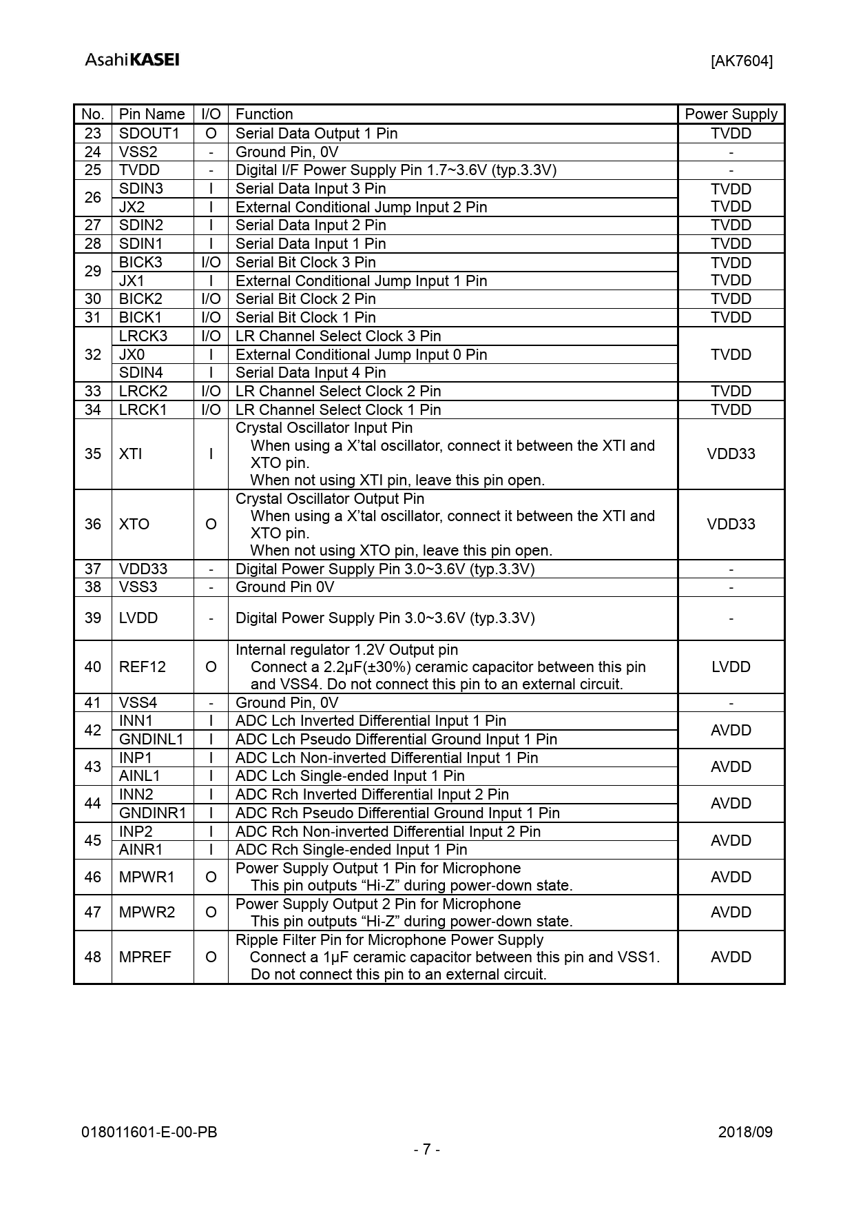 Pages / Page37 / 7 — [AK7604]. No. 25 33. 34 Pin Name. SDOUT1. VSS2. TVDD. SDIN3. JX2. SDIN2. …
