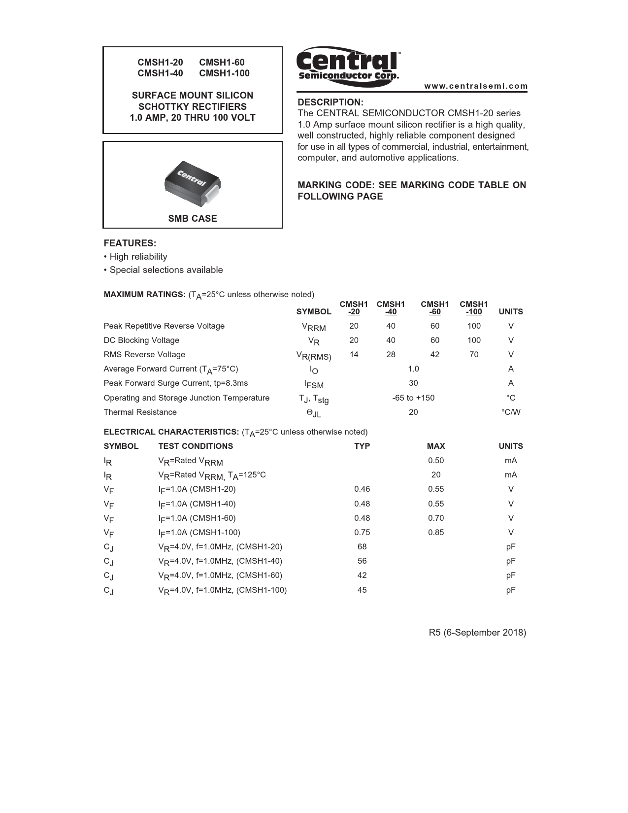 CMSH1-20CMSH1-60CMSH1-40CMSH1-100www.centra lsemi.comSURFACE MOUNT SILICONSCHOTTKY RECTIFIERSDESCRIPTION:1.0 AMP, 20 THRU 100 VOLT The CENTRAL SEMICONDUCTOR CMSH1-20 series 1.0 Amp surface mount silicon rectifier is a high quality, well constructed, highly reliable component designed for use in all types of commercial, industrial, entertainment, computer, and automotive applications. MARKING CODE: SEE MARKING CODE TABLE ONFOLLOWING PAGESMB CASEFEATURES: • High reliability • Special selections available MAXIMUM RATINGS: (TA=25°C unless otherwise noted) CMSH1 CMSH1 CMSH1 CMSH1SYMBOL-20-40-60-100UNITS Peak Repetitive Reverse Voltage VRRM 20 40 60 100 V DC Blocking Voltage VR 20 40 60 100 V RMS Reverse Voltage VR(RMS) 14 28 42 70 V Average Forward Current (TA=75°C) IO 1.0 A Peak Forward Surge Current, tp=8.3ms IFSM 30 A Operating and Storage Junction Temperature TJ, Tstg -65 to +150 °C Thermal Resistance ΘJL 20 °C/W ELECTRICAL CHARACTERISTICS: (TA=25°C unless otherwise noted) SYMBOL TESTCONDITIONSTYPMAXUNITS IR VR=Rated VRRM 0.50 mA IR VR=Rated VRRM, TA=125°C 20 mA VF IF=1.0A (CMSH1-20) 0.46 0.55 V VF IF=1.0A (CMSH1-40) 0.48 0.55 V VF IF=1.0A (CMSH1-60) 0.48 0.70 V VF IF=1.0A (CMSH1-100) 0.75 0.85 V CJ VR=4.0V, f=1.0MHz, (CMSH1-20) 68 pF CJ VR=4.0V, f=1.0MHz, (CMSH1-40) 56 pF CJ VR=4.0V, f=1.0MHz, (CMSH1-60) 42 pF CJ VR=4.0V, f=1.0MHz, (CMSH1-100) 45 pF R5 (6-September 2018)