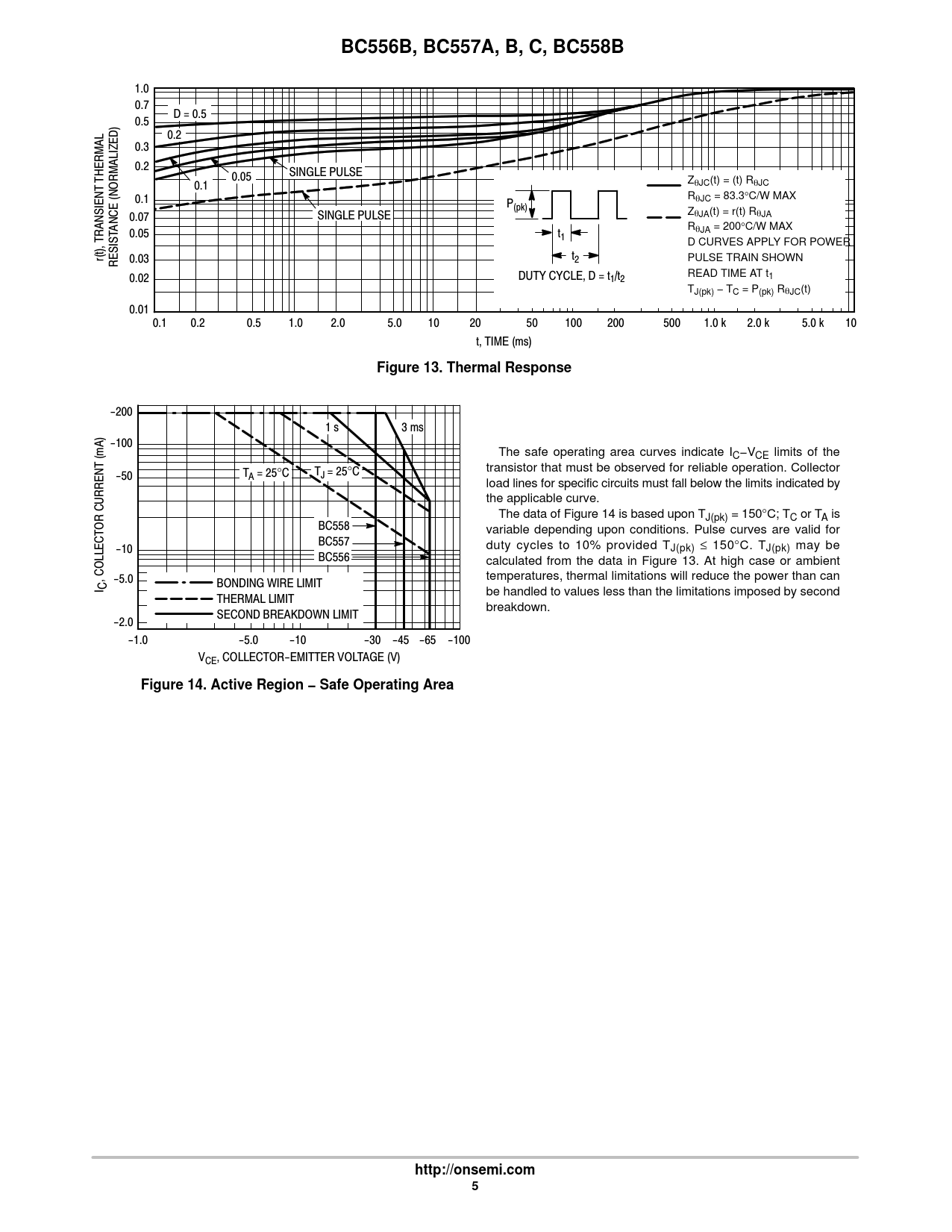 BC556B, BC557A, B, C, BC558B. Figure 13. Thermal Response. Figure 14. Active Region − Safe Operating Area. http://onsemi.com
