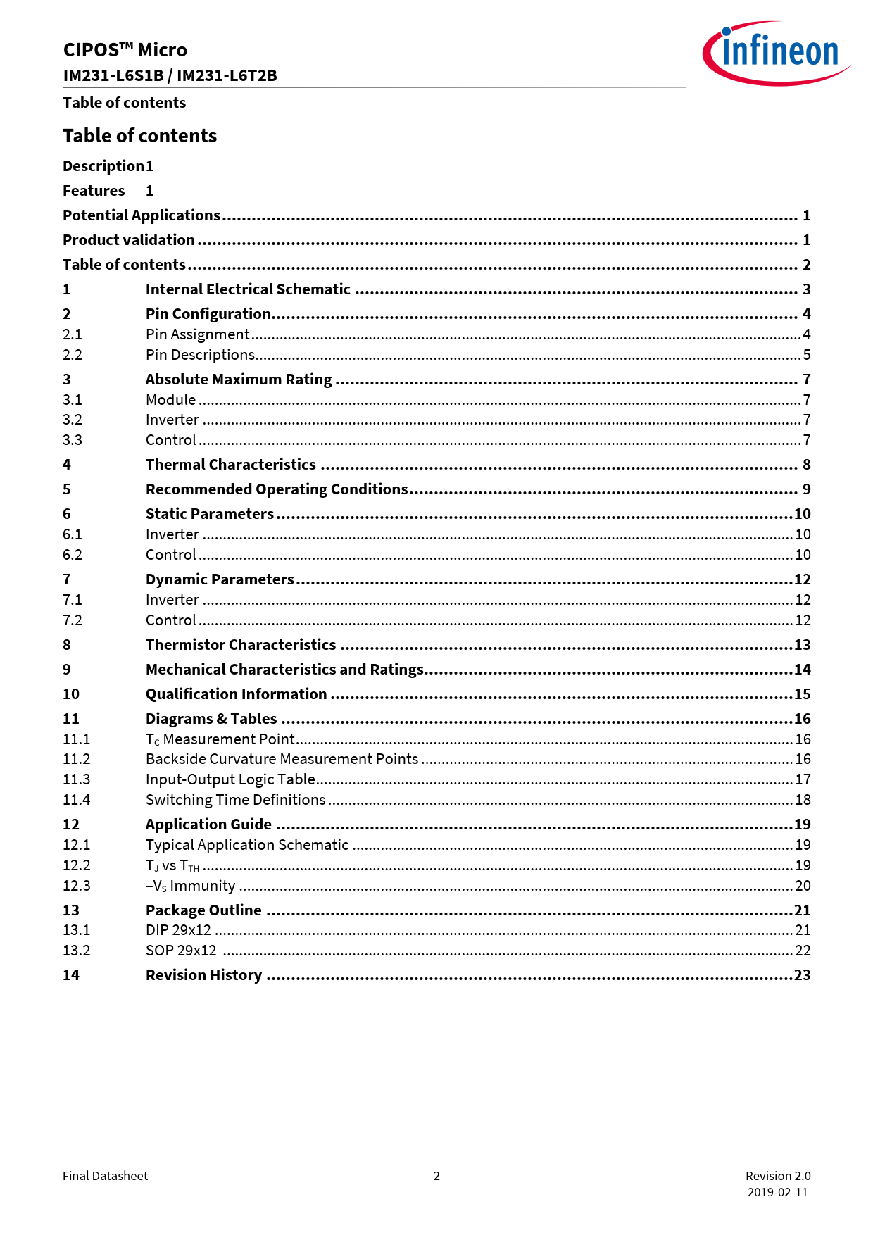 Final Datasheet 2 Revision 2.0 2019-02-11 Document Outline Description Features Potential Applications Product validation Table 1 Part Ordering Table Table of contents 1 Internal Electrical Schematic 2 Pin Configuration 3 Absolute Maximum Rating 4 Thermal Characteristics 5 Recommended Operating Conditions 6 Static Parameters 7 Dynamic Parameters 8 Thermistor Characteristics 9 Mechanical Characteristics and Ratings 10 Qualification Information 11 Diagrams & Tables 12 Application Guide 13 Package Outline Revision History Disclimer