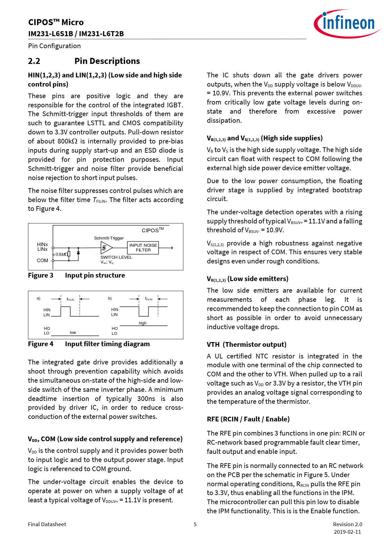 CIPOS™ Micro. IM231-L6S1B / IM231-L6T2B. 2.2. Pin Descriptions. HIN(1,2,3) and LIN(1,2,3) (Low side and high side. control pins)