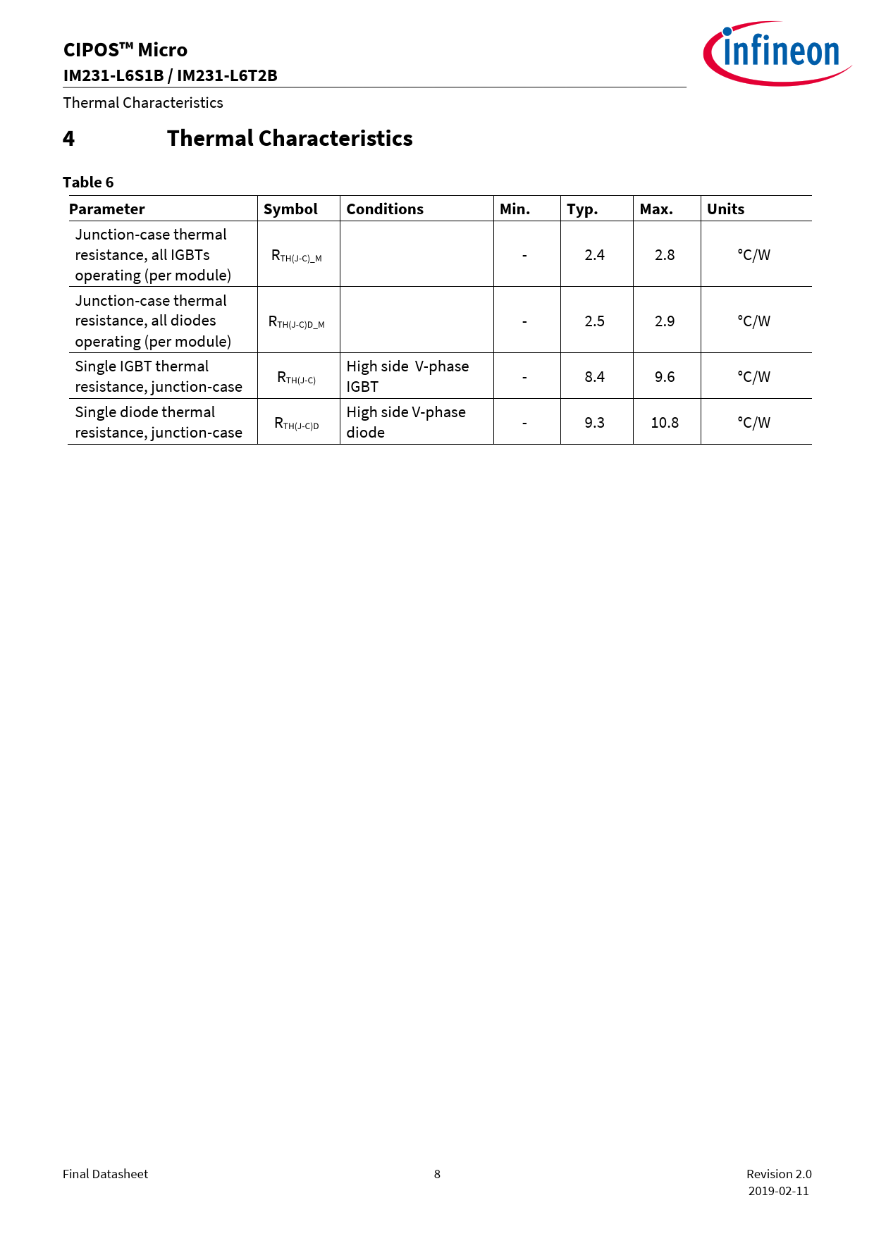 CIPOS™ Micro. IM231-L6S1B / IM231-L6T2B. Thermal Characteristics. Table 6. Parameter. Symbol. Conditions. Min. Typ. Max. Units
