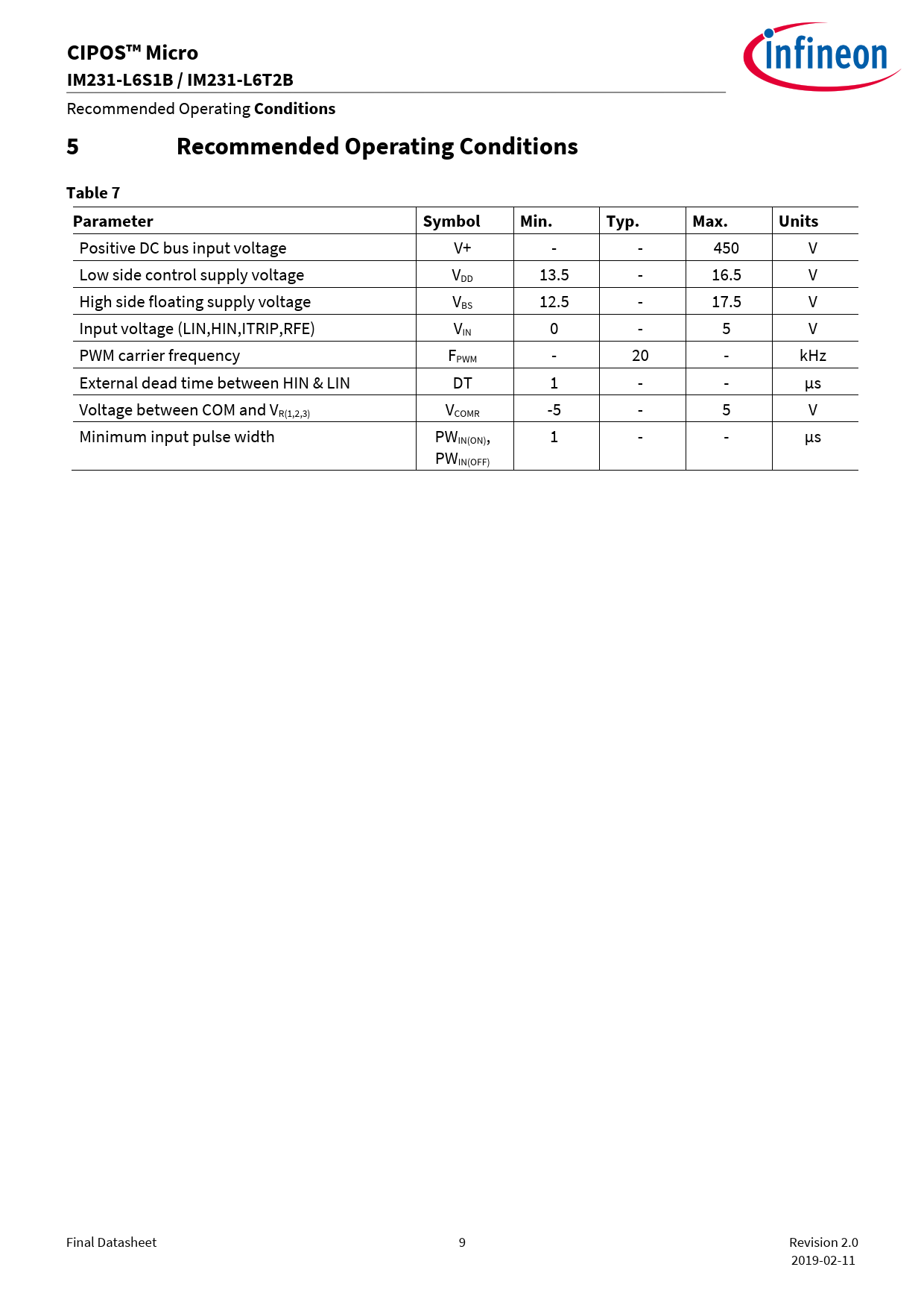 CIPOS™ Micro. IM231-L6S1B / IM231-L6T2B. Conditions 5. Recommended Operating Conditions. Table 7. Parameter. Symbol. Min. Typ. Max. Units