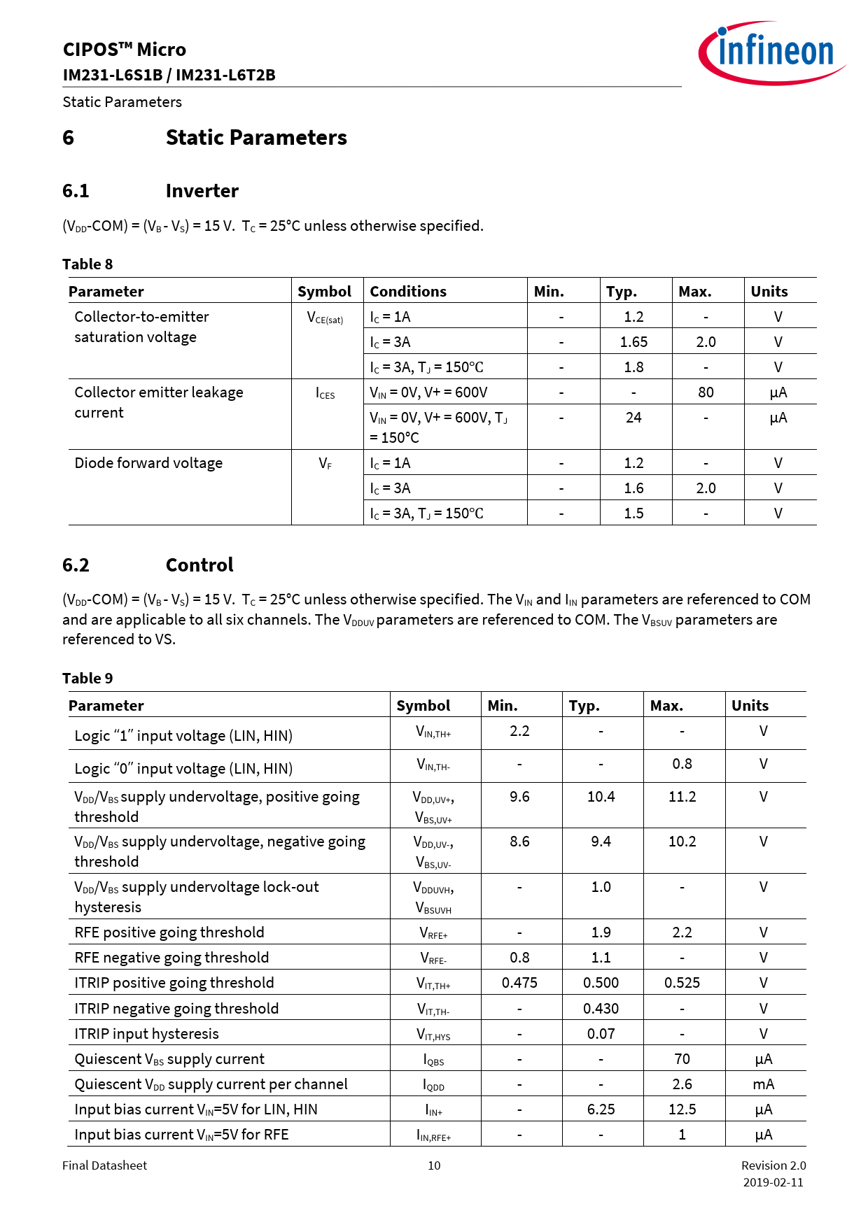 CIPOS™ Micro. IM231-L6S1B / IM231-L6T2B. Static Parameters. 6.1. Inverter. Table 8. Parameter. Symbol Conditions. Min. Typ. Max. Units. 6.2