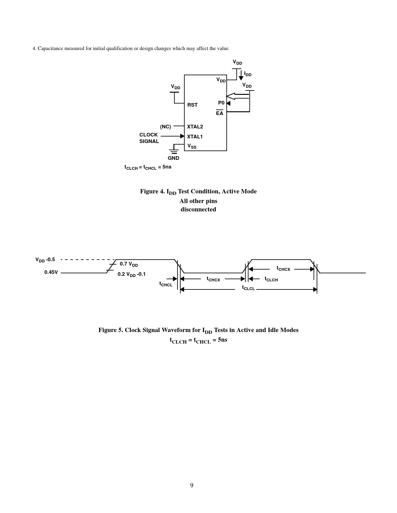 4. Capacitance measured for initial qualification or design changes which may affect the value. VDDIDDVDDVVDDDDRSTP0EA(NC)XTAL2CLOCKXTAL1SIGNALVSSGNDtCLCH = tCHCL = 5nsFigure 4. IDD Test Condition, Active ModeAll other pinsdisconnectedVDD -0.50.7 VDDtCHCX0.45V0.2 VDD -0.1tCHCXtCLCHtCHCLtCLCLFigure 5. Clock Signal Waveform for IDD Tests in Active and Idle ModestCLCH = tCHCL = 5ns 9