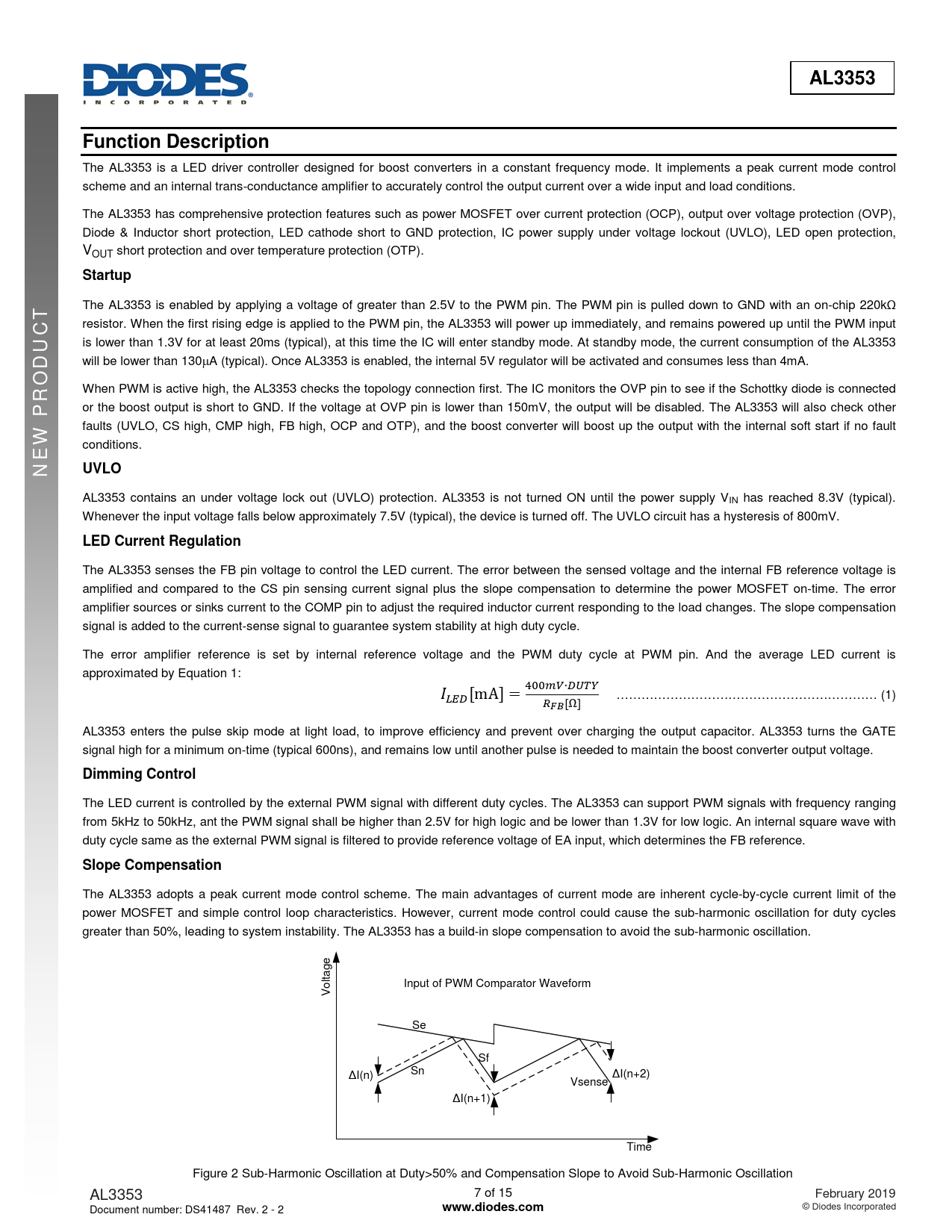 The AL3353 adopts a peak current mode control scheme. The main advantages of current mode are inherent cycle-by-cycle current limit of the power MOSFET and simple control loop characteristics. However, current mode control could cause the sub-harmonic oscillation for duty cycles greater than 50%, leading to system instability. The AL3353 has a build-in slope compensation to avoid the sub-harmonic oscillation. Input of PWM Comparator Waveform Voltage Se Sf ΔI(n) Sn ΔI(n+2) Vsense ΔI(n+1) Time Figure 2 Sub-Harmonic Oscillation at Duty>50% and Compensation Slope to Avoid Sub-Harmonic Oscillation AL3353 7 of 15 February 2019 Document number: DS41487 Rev. 2 - 2