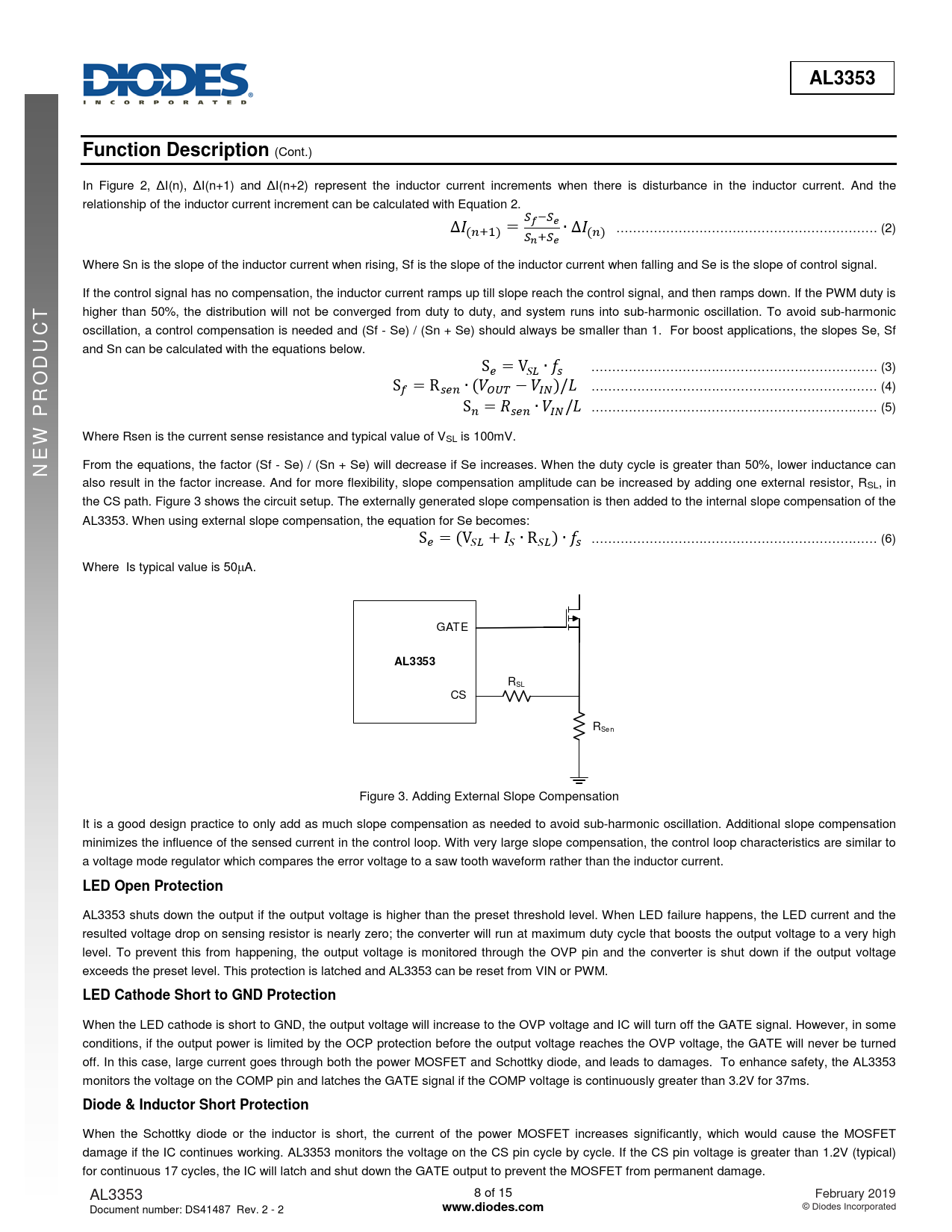 From the equations, the factor (Sf - Se) / (Sn + Se) will decrease if Se increases. When the duty cycle is greater than 50%, lower inductance can also result in the factor increase. And for more flexibility, slope compensation amplitude can be increased by adding one external resistor, RSL, in the CS path. Figure 3 shows the circuit setup. The externally generated slope compensation is then added to the internal slope compensation of the AL3353. When using external slope compensation, the equation for Se becomes: S𝑒𝑒 = (V𝑆𝑆𝐿𝐿 + 𝐼𝐼𝑆𝑆 ∙ R𝑆𝑆𝐿𝐿) ∙ 𝑓𝑓𝑠𝑠 …………………………………………………………… (6) Where Is typical value is 50µA. GATE