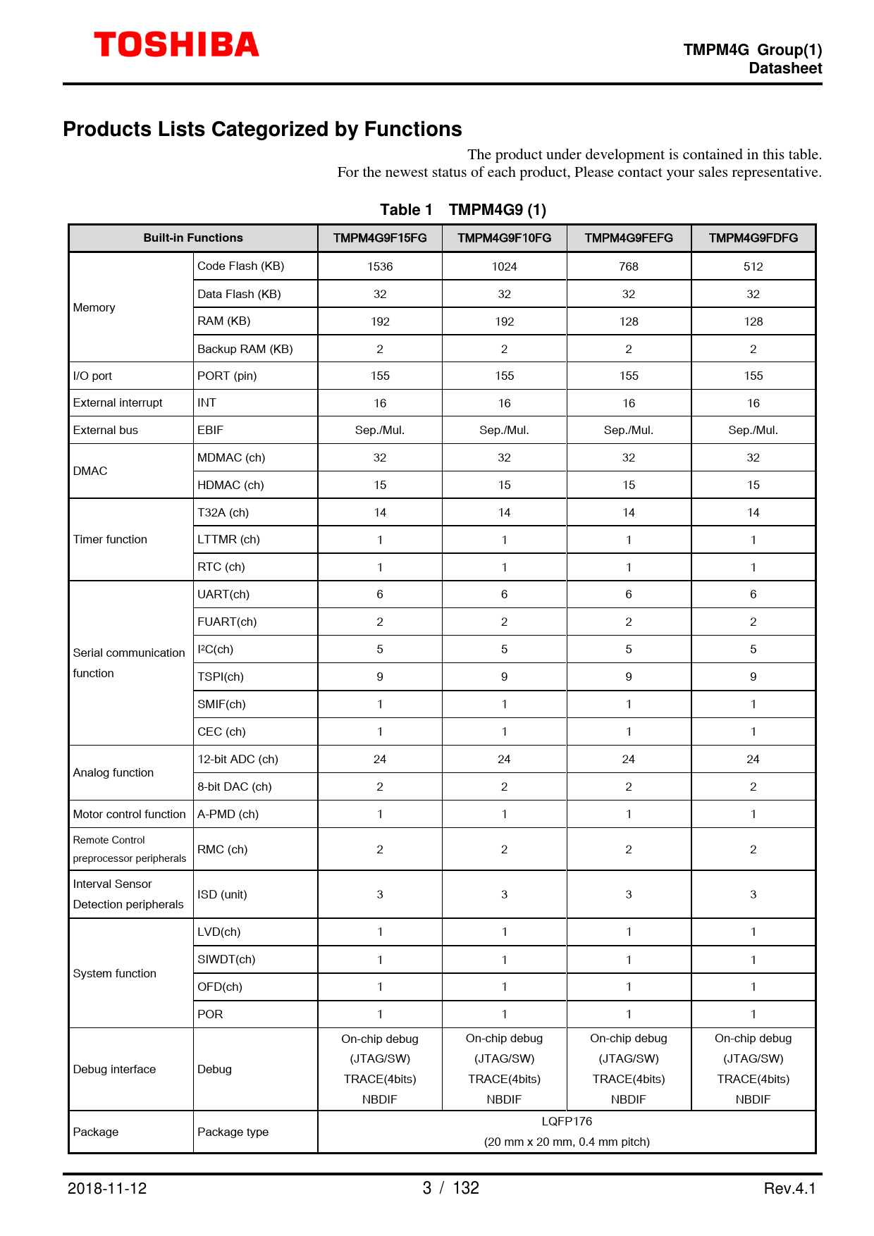 TMPM4G Group(1) Datasheet Products Lists Categorized by Functions