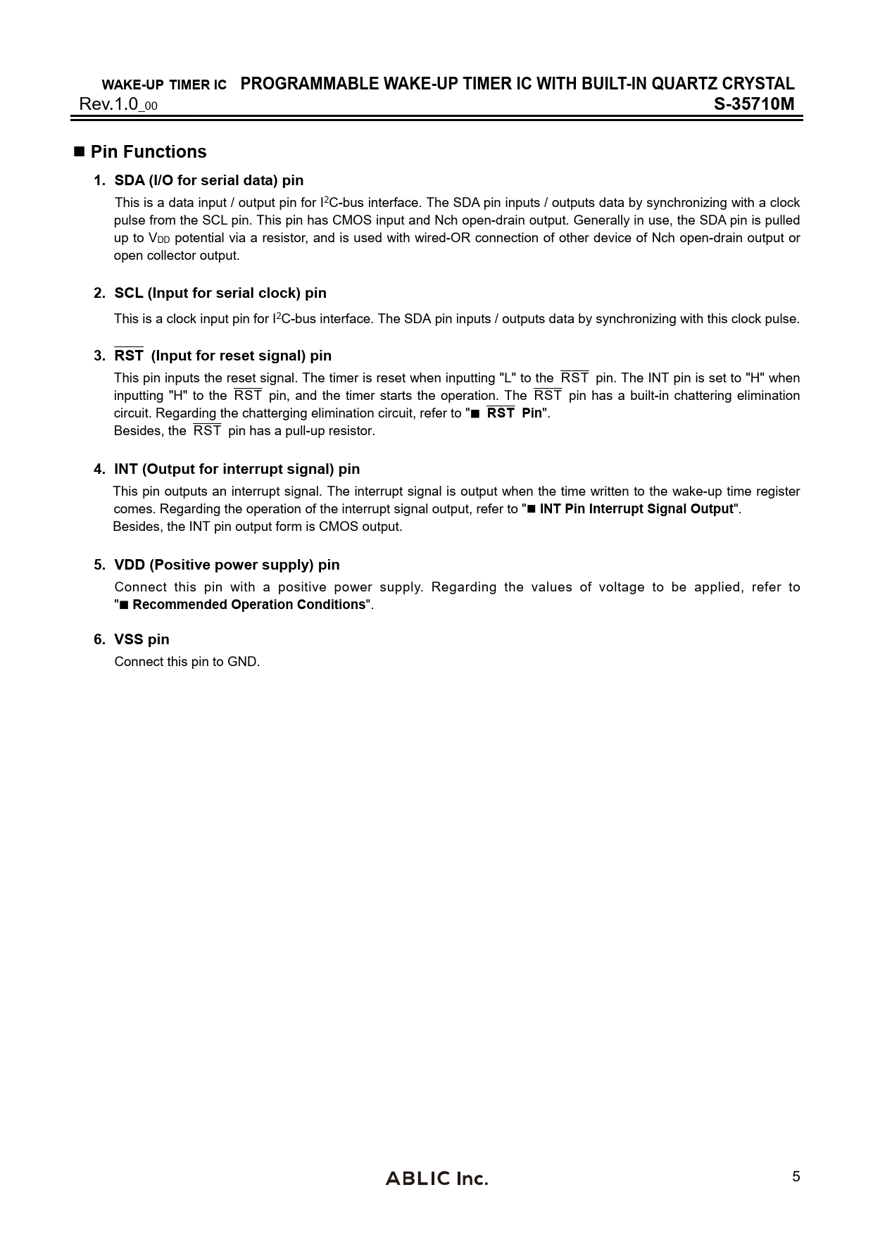 WAKE-UP TIMER IC PROGRAMMABLE WAKE-UP TIMER IC WITH BUILT-IN QUARTZ CRYSTAL Rev.1.0_00 S-35710MPin Functions1. SDA (I/O for serial data) pin This is a data input / output pin for I2C-bus interface. The SDA pin inputs / outputs data by synchronizing with a clock pulse from the SCL pin. This pin has CMOS input and Nch open-drain output. Generally in use, the SDA pin is pulled up to VDD potential via a resistor, and is used with wired-OR connection of other device of Nch open-drain output or open collector output. 2. SCL (Input for serial clock) pin This is a clock input pin for I2C-bus interface. The SDA pin inputs / outputs data by synchronizing with this clock pulse. _______ 3. RST (Input for reset signal) pin _______ This pin inputs the reset signal. The timer is reset when inputting "L" to the RST pin. The INT pin is set to "H" when _______ _______ inputting "H" to the RST pin, and the timer starts the operation. The RST pin has a built-in chattering elimination _______ circuit. Regarding the chatterging elimination circuit, refer to " RST Pin ". _______ Besides, the RST pin has a pull-up resistor. 4. INT (Output for interrupt signal) pin This pin outputs an interrupt signal. The interrupt signal is output when the time written to the wake-up time register comes. Regarding the operation of the interrupt signal output, refer to " INTPin Interrupt Signal Output ". Besides, the INT pin output form is CMOS output. 5. VDD (Positive power supply) pin Connect this pin with a positive power supply. Regarding the values of voltage to be applied, refer to " Recommended Operation Conditions ". 6. VSS pin Connect this pin to GND. 5
