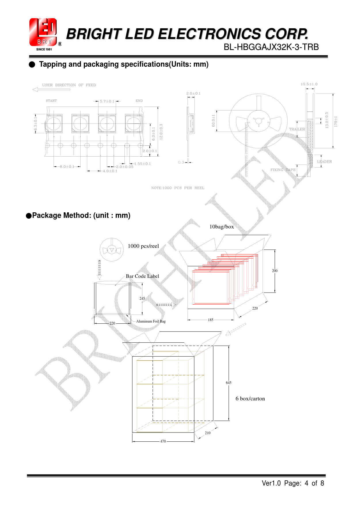 | Pages / Page | 8 / 4 — BRIGHT LED ELECTRONICS CORP. Tapping and packaging specifications(Units: … |