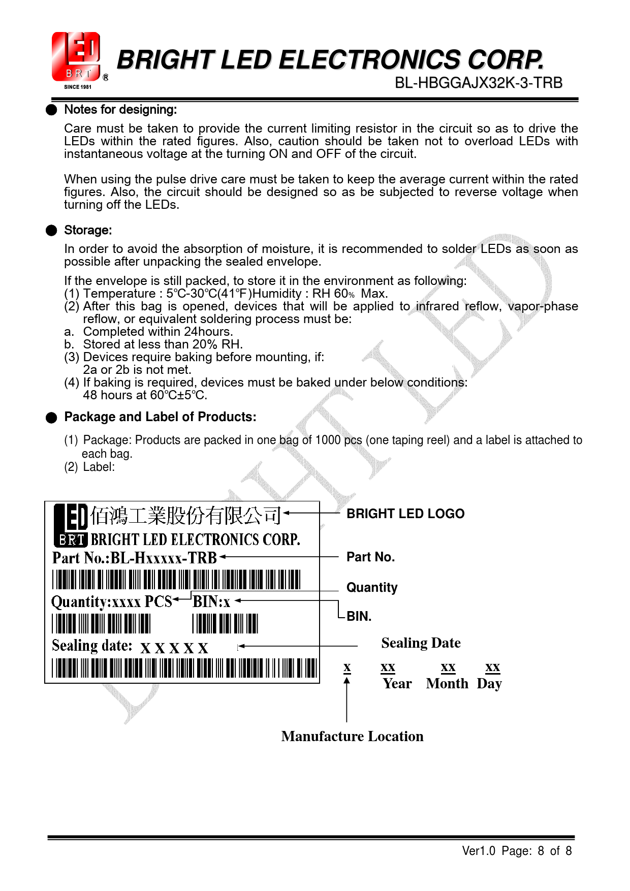 BRIGHT LED ELECTRONICS CORP. BL-HBGGAJX32K-3-TRB ● Notes for designing: Care must be taken to provide the current limiting resistor in the circuit so as to drive the LEDs within the rated figures. Also, caution should be taken not to overload LEDs with instantaneous voltage at the turning ON and OFF of the circuit. When using the pulse drive care must be taken to keep the average current within the rated figures. Also, the circuit should be designed so as be subjected to reverse voltage when turning off the LEDs. ● Storage: In order to avoid the absorption of moisture, it is recommended to solder LEDs as soon as possible after unpacking the sealed envelope. If the envelope is still packed, to store it in the environment as following: (1) Temperature : 5℃-30℃(41℉)Humidity : RH 60﹪ Max. (2) After this bag is opened, devices that will be applied to infrared reflow, vapor-phase reflow, or equivalent soldering process must be: a. Completed within 24hours. b. Stored at less than 20% RH. (3) Devices require baking before mounting, if: 2a or 2b is not met. (4) If baking is required, devices must be baked under below conditions: 48 hours at 60℃±5℃. ● Package and Label of Products: (1) Package: Products are packed in one bag of 1000 pcs (one taping reel) and a label is attached to each bag. (2) Label: BRIGHT LED LOGOPart No.QuantityBIN.Sealing DateX X X X Xx xx xx xxYearMonthDayManufacture Location Ver1.0 Page: 8 of 8