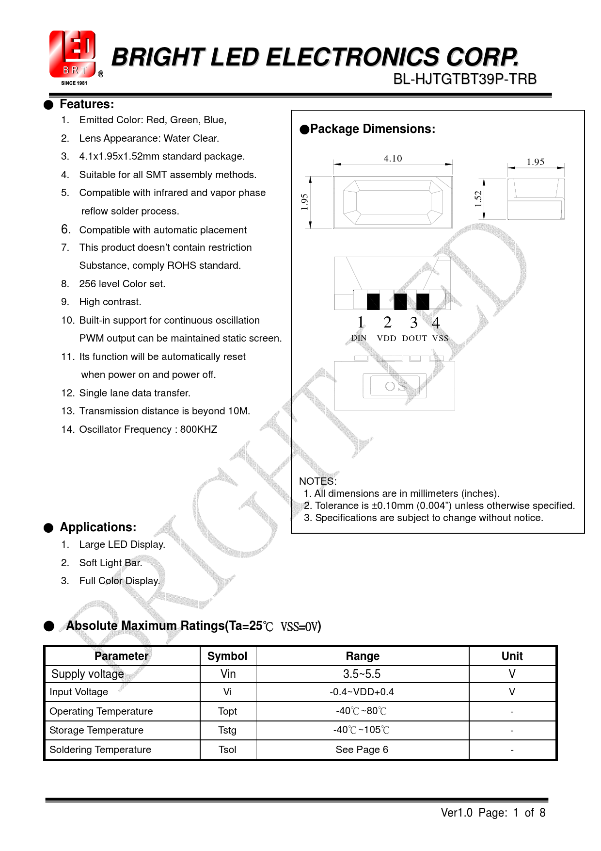 2. Lens Appearance: Water Clear. 3. 4.1x1.95x1.52mm standard package. 4.10 1.95 4. Suitable for all SMT assembly methods. 5. Compatible with infrared and vapor phase 2 5 reflow solder process. 1.95 1. 6. Compatible with automatic placement 7. This product doesn’t contain restriction Substance, comply ROHS standard. 8. 256 level Color set. 9. High contrast. 10. Built-in support for continuous oscillation 1 2 3 4 PWM output can be maintained static screen. DIN VDD DOUT VSS 11. Its function will be automatically reset when power on and power off. 12. Single lane data transfer. 13. Transmission distance is beyond 10M. 14. Oscillator Frequency : 800KHZ NOTES: 1. All dimensions are in millimeters (inches). 2. Tolerance is ±0.10mm (0.004”) unless otherwise specified. 3. Specifications are subject to change without notice. ●