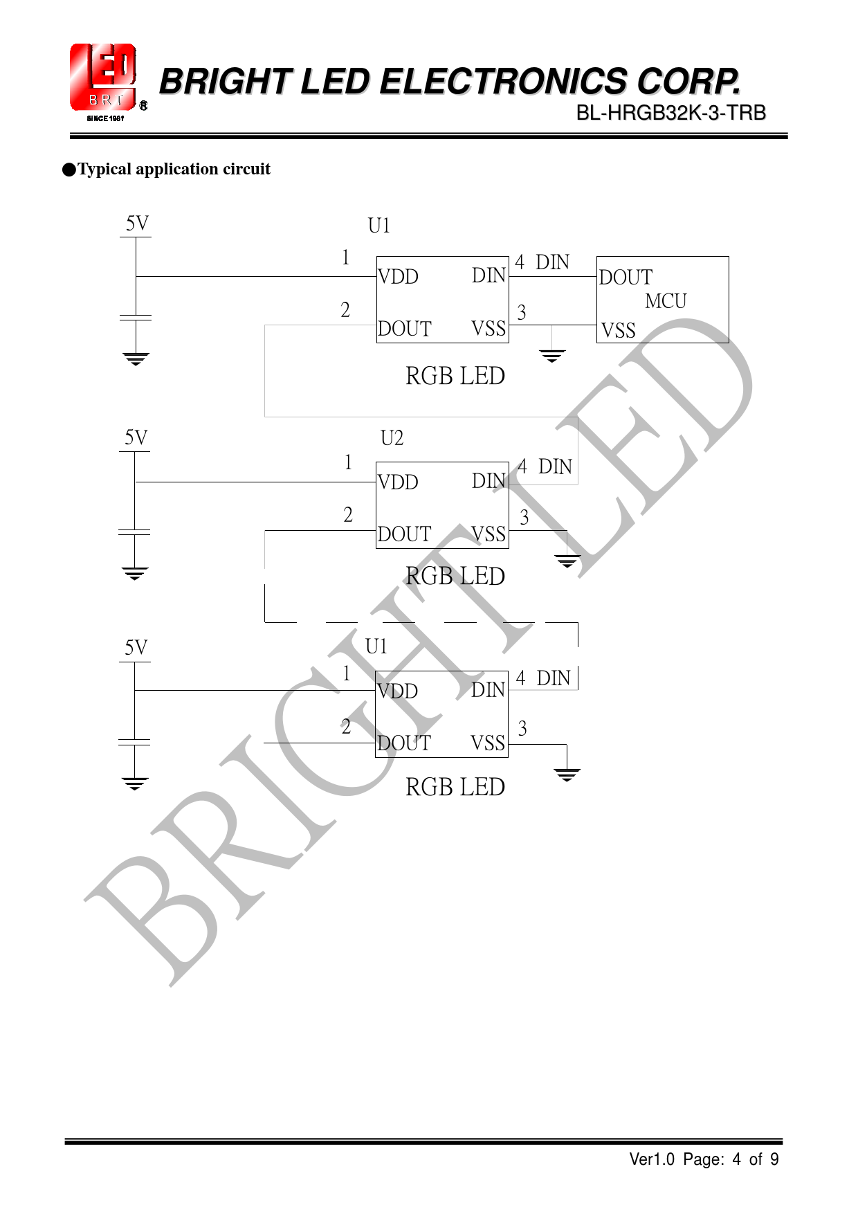 5V U1 1 4 DIN VDD DIN DOUT 2 MCU 3 DOUT VSS VSS RGB LED 5V U2 1 4 DIN VDD DIN 2 3 DOUT VSS RGB LED 5V U1 1 4 DIN VDD DIN 2 3 DOUT VSS RGB LED Ver1.0 Page: 4 of 9