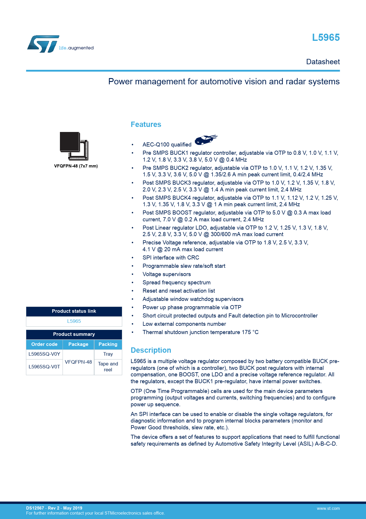 L5965. Features. VFQFPN-48 (7x7 mm). Product status link. Product summary. Order code. Package. Packing. Description. DS12567. Rev 2