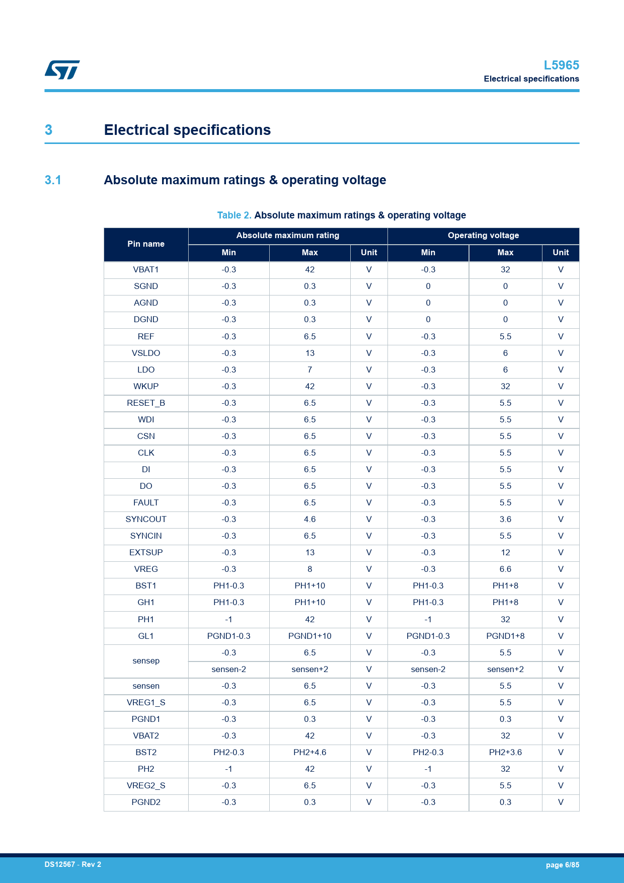 L5965 Electrical specifications 3 Electrical specifications 3.1 Absolute maximum ratings & operating voltage Table 2. Absolute maximum ratings & operating voltage Absolute maximum rating Operating voltage Pin name Min Max Unit Min Max Unit
