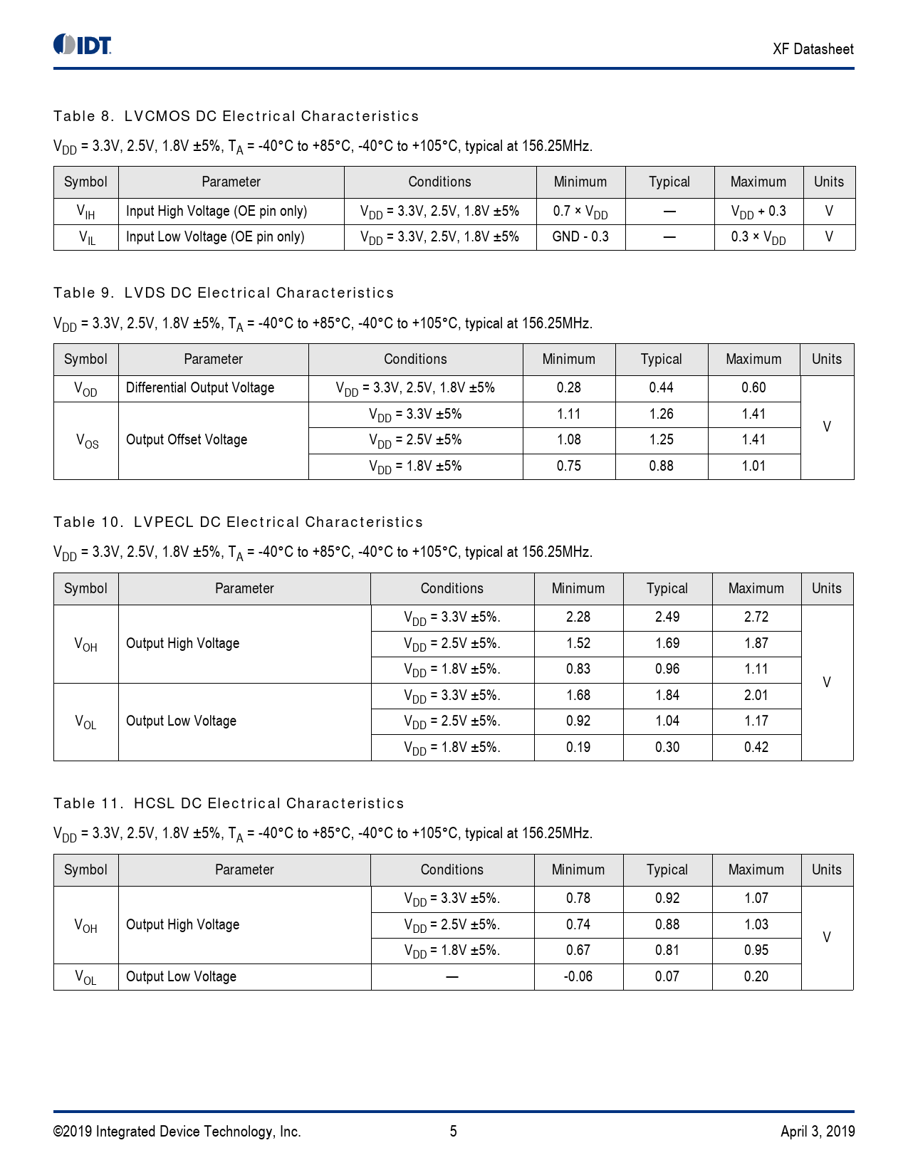 VDD = 3.3V ±5%. 0.78 0.92 1.07 VOH Output High Voltage VDD = 2.5V ±5%. 0.74 0.88 1.03 V VDD = 1.8V ±5%. 0.67 0.81 0.95 VOL Output Low Voltage — -0.06 0.07 0.20 ©2019 Integrated Device Technology, Inc. 5 April 3, 2019 Document Outline Description Pin Assignments Features Typical Applications Table 1. Pin Descriptions Absolute Maximum Ratings Table 2. Absolute Maximum Ratings ESD Compliance Table 3. ESD Compliance Mechanical Testing Table 4. Mechanical Testing * Solder Reflow Profile DC Electrical Characteristics Table 5. 3.3V IDD DC Electrical Characteristics Table 6. 2.5V IDD DC Electrical Characteristics Table 7. 1.8V IDD DC Electrical Characteristics Table 8. LVCMOS DC Electrical Characteristics Table 9. LVDS DC Electrical Characteristics Table 10. LVPECL DC Electrical Characteristics Table 11. HCSL DC Electrical Characteristics Table 12. CML DC Electrical Characteristics Table 13. DC Electrical Characteristics – Leakage Current AC Electrical Characteristics Table 14. 3.3V AC Electrical Characteristics Table 15. 2.5V AC Electrical Characteristics Table 16. 1.8V AC Electrical Characteristics Table 17. Phase Jitter Characteristics Output Waveforms Figure 1. LVDS Output Waveforms Figure 2. LVPECL Output Waveforms Figure 3. HCSL Output Waveforms Figure 4. CML Output Waveforms Termination for 3.3V LVPECL Outputs Figure 5. 3.3V LVPECL Output Termination Figure 6. 3.3V LVPECL Output Termination Termination for 2.5V LVPECL Outputs Figure 7. 2.5V LVPECL Driver Termination Example Figure 8. 2.5V LVPECL Driver Termination Example Figure 9. 2.5V LVPECL Driver Termination Example LVDS Driver Termination Figure 10. Standard LVDS Termination Figure 11. Optional LVDS Termination Recommended Termination for HCSL Outputs Figure 12. Recommended Source Termination (where the driver and receiver will be on separate PCBs) Figure 13. Recommended Termination (where a point-to-point connection can be used) CML Termination Figure 14. CML Termination Example Package Outline Drawings Marking Diagram Ordering Information Revision History