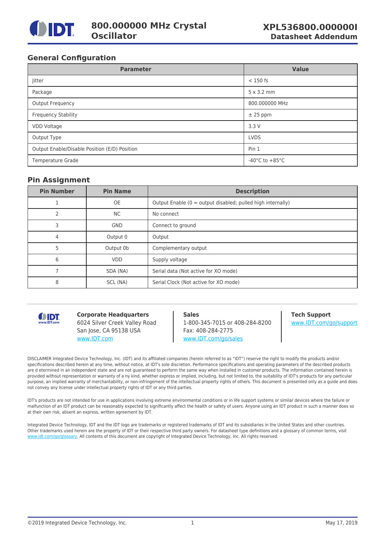Datasheet Addendum XPL536800.000000I (IDT)