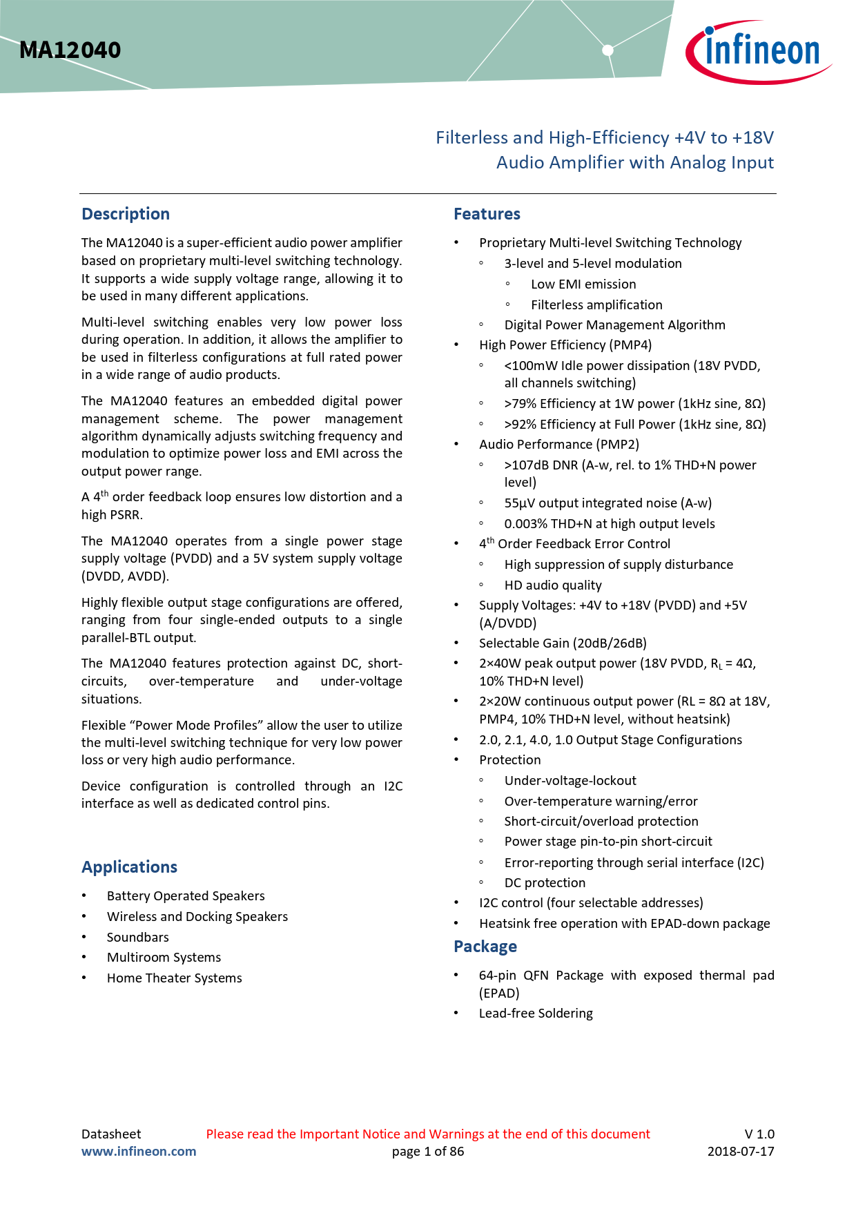 • Multiroom Systems • Home Theater Systems • 64-pin QFN Package with exposed thermal pad (EPAD) • Lead-free Soldering Datasheet Please read the Important Notice and Warnings at the end of this document V 1.0