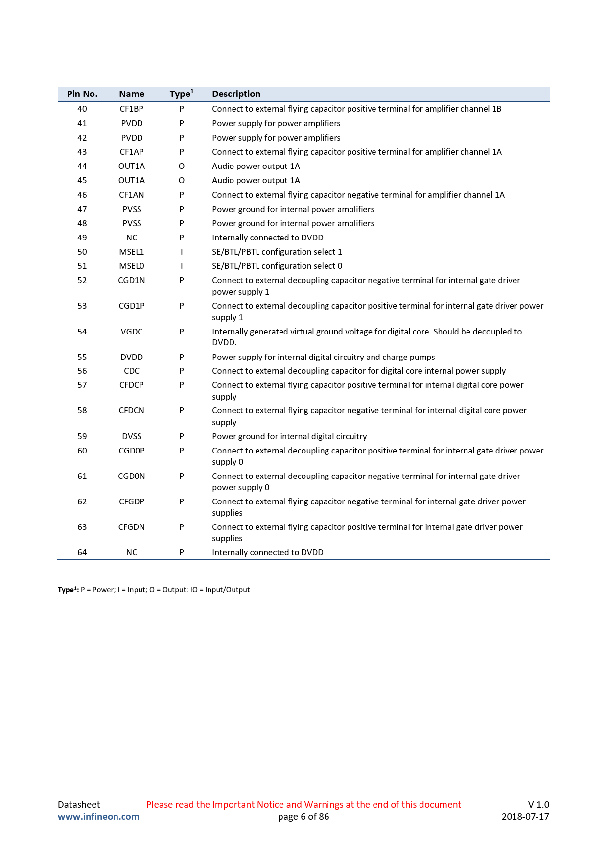Pin No.NameType1Description 40 CF1BP P Connect to external flying capacitor positive terminal for amplifier channel 1B 41 PVDD P Power supply for power amplifiers 42 PVDD P Power supply for power amplifiers 43 CF1AP P Connect to external flying capacitor positive terminal for amplifier channel 1A 44 OUT1A O Audio power output 1A 45 OUT1A O Audio power output 1A 46 CF1AN P Connect to external flying capacitor negative terminal for amplifier channel 1A 47 PVSS P Power ground for internal power amplifiers 48 PVSS P Power ground for internal power amplifiers 49 NC P Internally connected to DVDD 50 MSEL1 I SE/BTL/PBTL configuration select 1 51 MSEL0 I SE/BTL/PBTL configuration select 0 52 CGD1N P Connect to external decoupling capacitor negative terminal for internal gate driver power supply 1 53 CGD1P P Connect to external decoupling capacitor positive terminal for internal gate driver power supply 1 54 VGDC P Internally generated virtual ground voltage for digital core. Should be decoupled to DVDD. 55 DVDD P Power supply for internal digital circuitry and charge pumps 56 CDC P Connect to external decoupling capacitor for digital core internal power supply 57 CFDCP P Connect to external flying capacitor positive terminal for internal digital core power supply 58 CFDCN P Connect to external flying capacitor negative terminal for internal digital core power supply 59 DVSS P Power ground for internal digital circuitry 60 CGD0P P Connect to external decoupling capacitor positive terminal for internal gate driver power supply 0 61 CGD0N P Connect to external decoupling capacitor negative terminal for internal gate driver power supply 0 62 CFGDP P Connect to external flying capacitor negative terminal for internal gate driver power supplies 63 CFGDN P Connect to external flying capacitor positive terminal for internal gate driver power supplies 64 NC P Internally connected to DVDD Type1: P = Power; I = Input; O = Output; IO = Input/Output Datasheet Please read the Important Notice and Warnings at the end of this document V 1.0 www.infineon.com page 6 of 86 2018-07-17