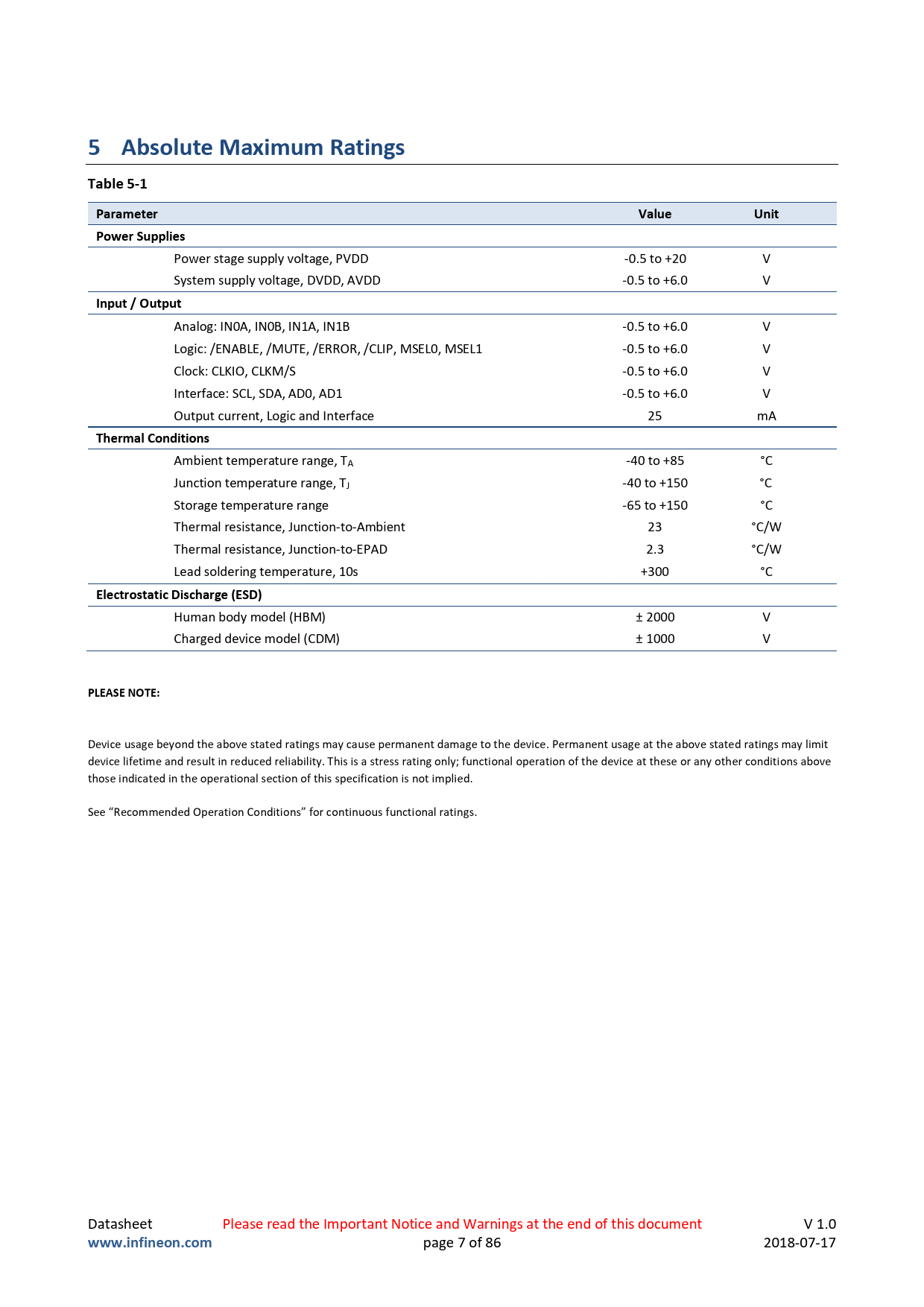 Device usage beyond the above stated ratings may cause permanent damage to the device. Permanent usage at the above stated ratings may limit device lifetime and result in reduced reliability. This is a stress rating only; functional operation of the device at these or any other conditions above those indicated in the operational section of this specification is not implied. See “Recommended Operation Conditions” for continuous functional ratings. Datasheet Please read the Important Notice and Warnings at the end of this document V 1.0