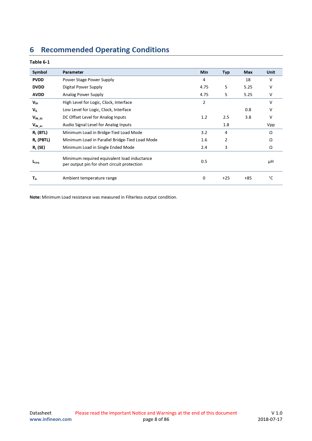 Minimum Load resistance was measured in Filterless output condition. Datasheet Please read the Important Notice and Warnings at the end of this document V 1.0
