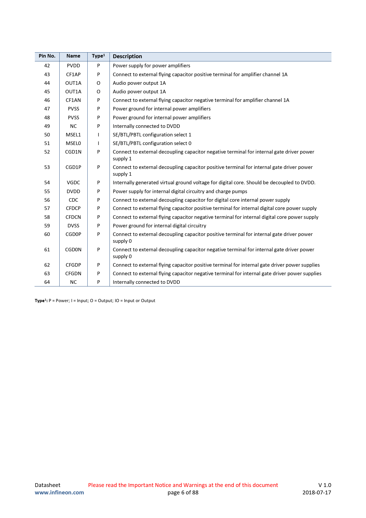 P = Power; I = Input; O = Output; IO = Input or Output Datasheet Please read the Important Notice and Warnings at the end of this document V 1.0