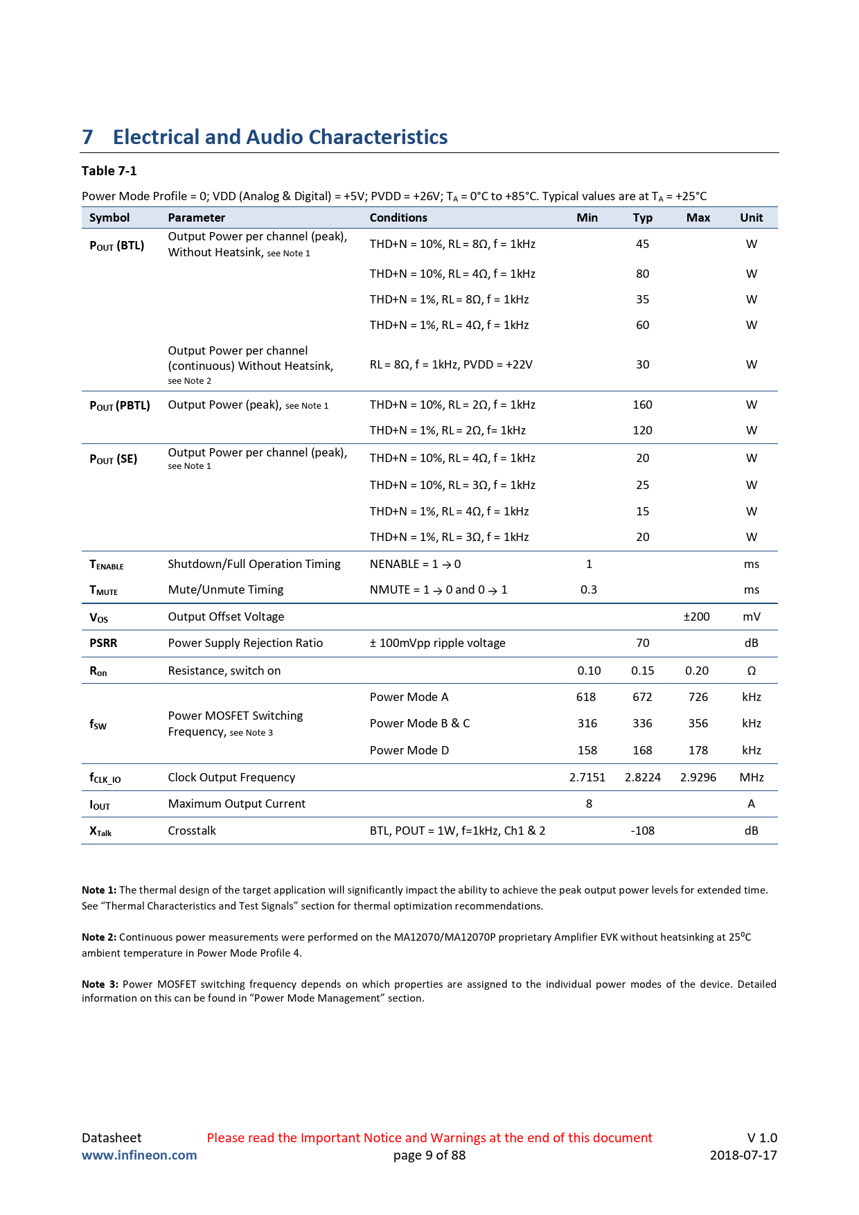 7 Electrical and Audio Characteristics Table 7-1 Symbol Parameter Conditions Min Typ Max Unit POUT (BTL) POUT (PBTL) POUT (SE)